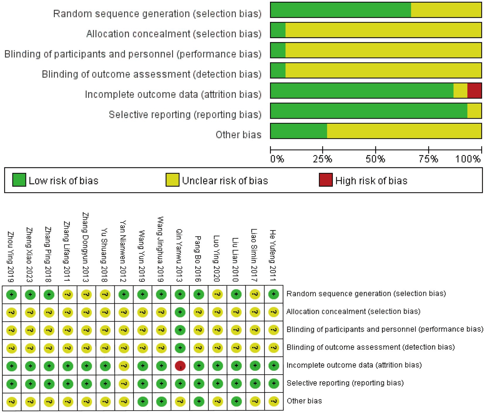 All 15 RCTs reported using randomization methods, although five studies (20, 23, 26, 27, 30) failed to specify the specific randomization techniques employed. Only one study (29) described adequate allocation concealment using the envelope method, while the remaining studies provided insufficient information on allocation concealment procedures. Blinding of participants, personnel, and outcome assessors was explicitly reported in only one study (29). One study (24) exclusively reported differences in outcome measures before and after treatment without other methodological details. Another study (29) did not account for drop-out cases in the analysis. Eleven studies were rated as having an unclear risk of bias in the “other bias” category due to insufficient reporting. The overall assessment indicated significant methodological concerns, primarily stemming from inadequate allocation concealment and lack of blinding procedures. The complete risk of bias assessment is presented in Figure 2.