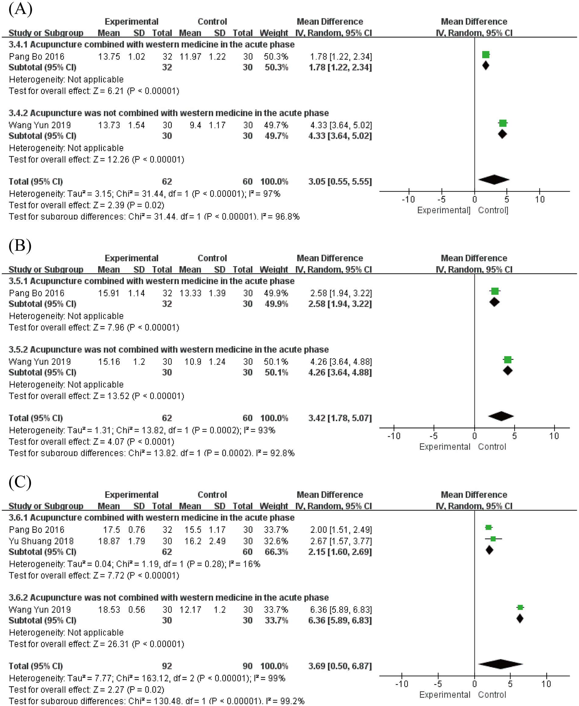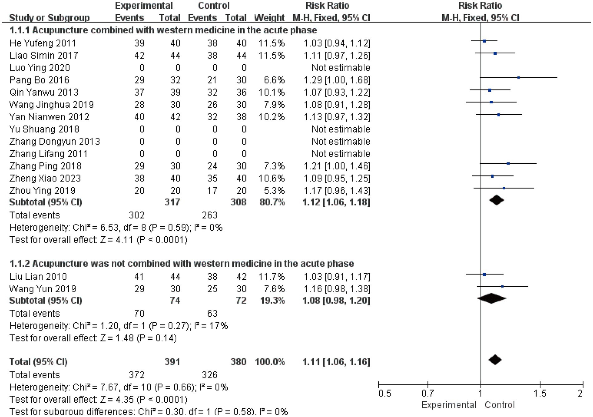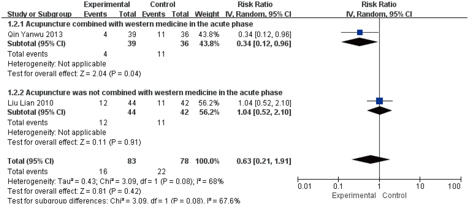 Comparisons: During the acute phase, the control group received conventional treatment excluding acupuncture interventions. In the non-acute phase, both control and experimental groups received identical treatment regimens.