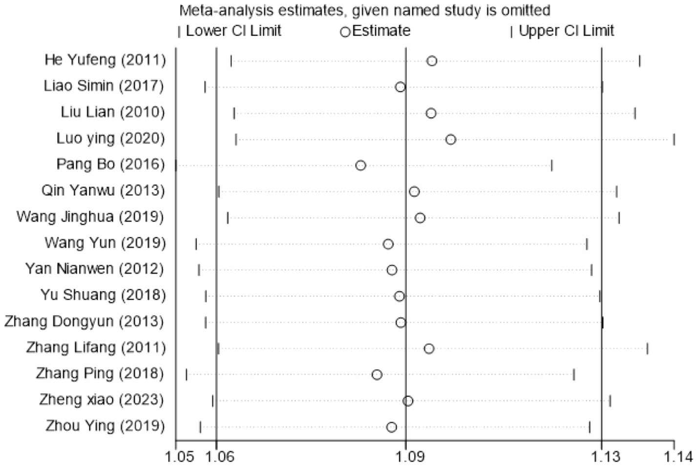 The clinical effective rate was analyzed across all 15 included studies (19–33), encompassing 771 patients. Statistical analysis revealed no significant heterogeneity (I2 = 0%, p > 0.05), supporting the use of a fixed-effects model. The subgroup analysis results showed a Risk Ratio (RR) of 1.12 (I2 = 0, 95%CI [1.06, 1.18], P < 0.0001) and another RR of 1.08 (I2 = 17, 95%CI [0.98, 1.20], p = 0.14) (Figure 3). This suggests that while the combination therapy is clearly beneficial, the evidence is insufficient to conclude that acupuncture as a standalone treatment significantly outperforms Western medicine in terms of clinical effective rate. Sensitivity analysis confirmed the robustness of these results (Figure 4). Egger’s test suggested potential publication bias (p = 0.001); however, application of the trim-and-fill method confirmed that the pooled effect size remained robust (Supplementary Figures S1–S5).