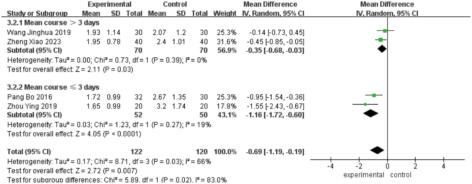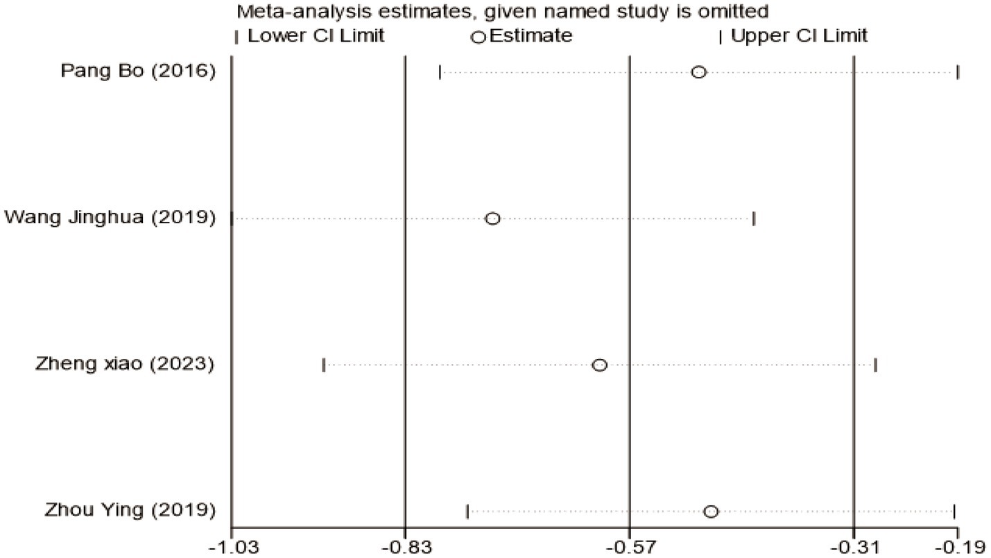 To investigate the sources of heterogeneity in H-B scale outcomes, a subgroup analysis was conducted based on mean disease course (≤3 days vs. >3 days). While this approach partially explained the observed heterogeneity, subsequent sensitivity analysis identified the study by Lifang et al. (23) as a major contributor (Supplementary Figure S8). This study employed a substantially longer intervention time (42 days) compared to others in the same subgroup (typically 21–28 days). Exclusion of this study reduced heterogeneity within subgroups from I2 = 81% to I2 = 19%, confirming intervention time as a key source of heterogeneity (Figure 5). The pooled analysis of the remaining studies demonstrated a significant mean difference of −0.69 (95% CI [−1.19, −0.19], p < 0.05), indicating that acupuncture combined with Western medicine during the acute phase provides superior improvement in H-B scale scores compared to Western medicine alone. Sensitivity analysis confirmed the stability of these findings (Figure 6), and Egger’s test showed no significant publication bias (p = 0.374; Supplementary Figures S9–S11).
