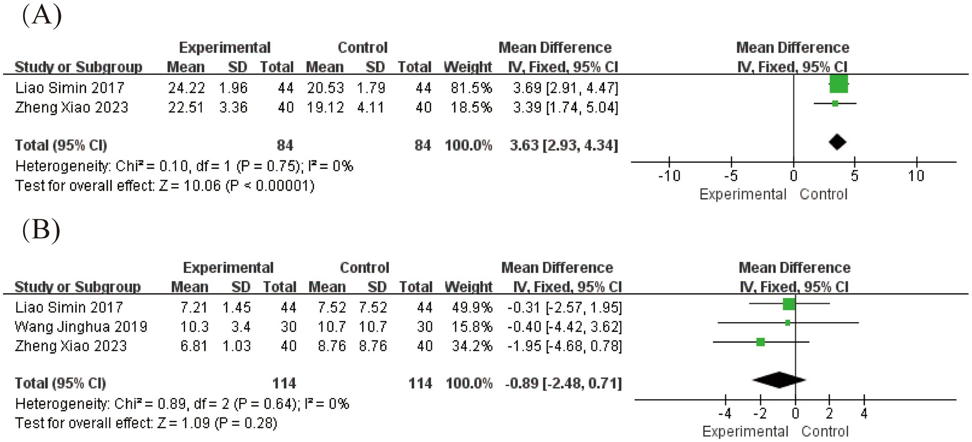 Figure 7. Forest plot for FDI scores. (A) Forest plot for FDIP scores, (B) Forest plot for FDIS scores.