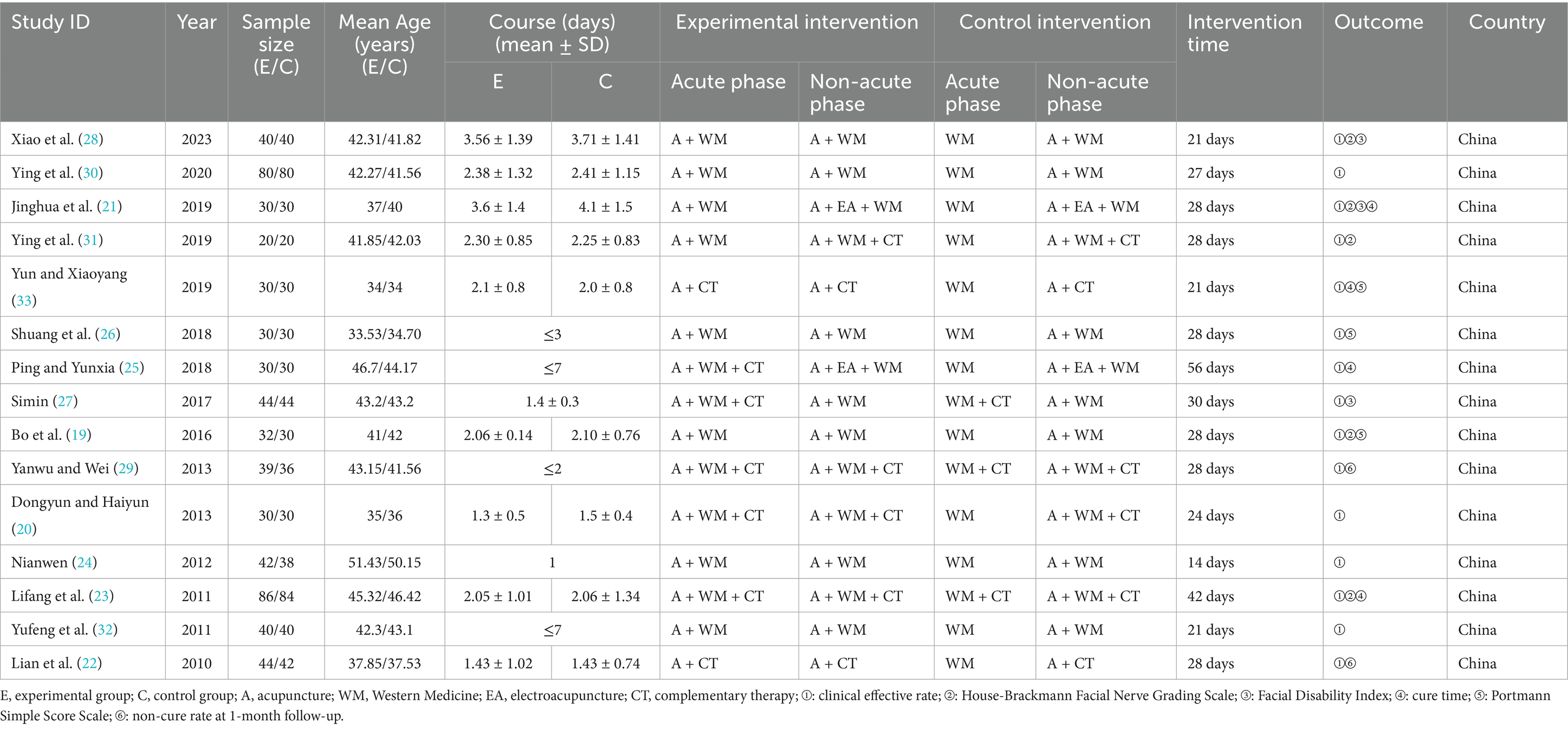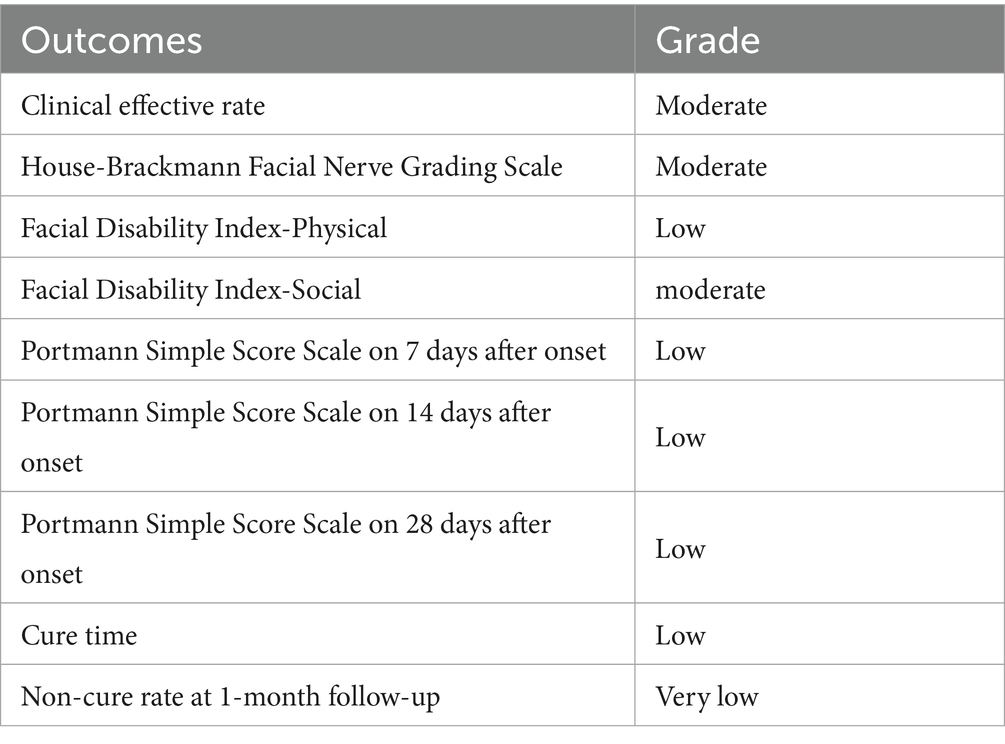 Outcome measures: The clinical effective rate served as the primary outcome. Secondary outcomes included the House-Brackmann Facial Nerve Grading Scale (H-B scale), Facial Disability Index (FDI), Portmann Simple Score Scale (Portmann score), non-cure rate at 1-month follow-up, and cure time.