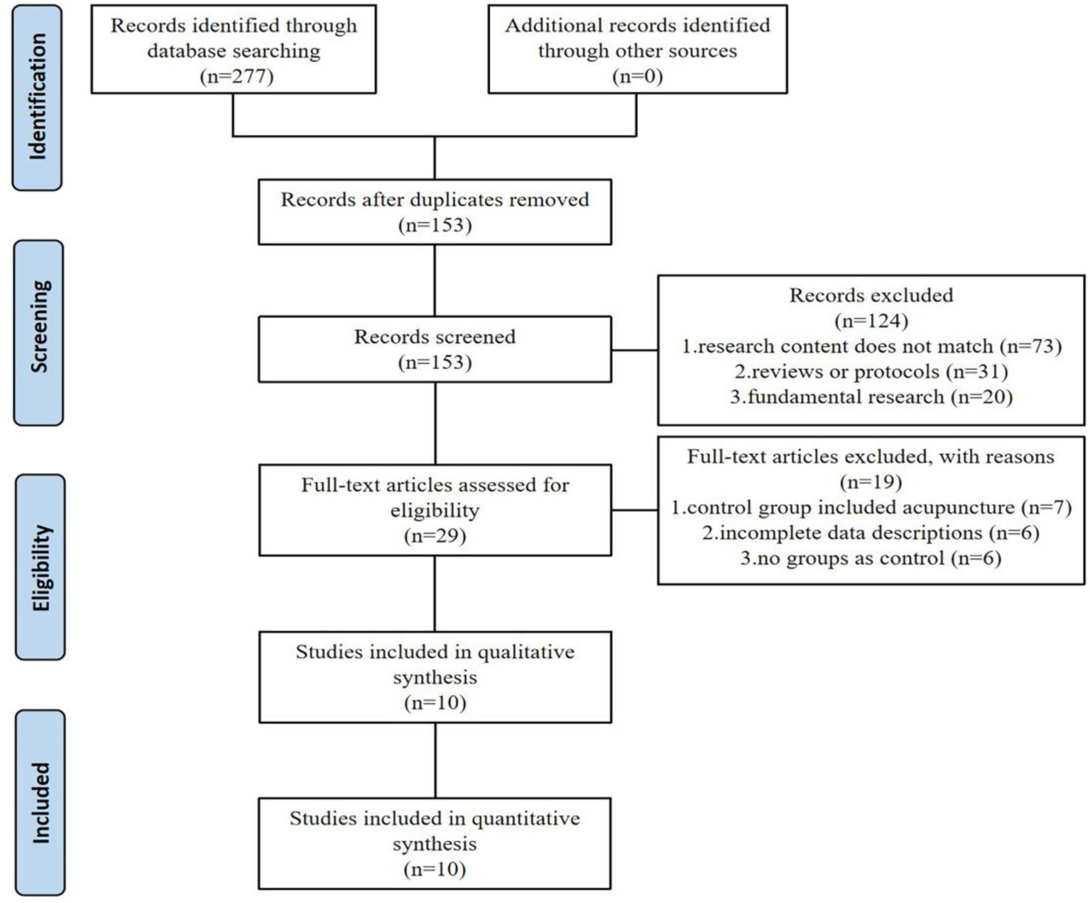 A comprehensive literature search identified 277 records through electronic database retrieval. After removal of duplicates, 153 unique records were retained for screening, of which 124 were excluded following title and abstract assessment. The remaining 29 full-text articles were evaluated for eligibility, and 19 were excluded after detailed review. Ultimately, 10 studies satisfied the inclusion criteria and were incorporated into the subsequent meta-analysis (Figure 1).