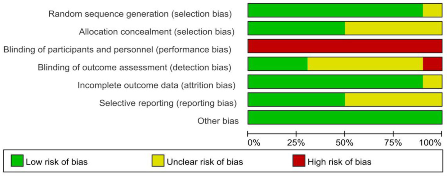 The risk of bias in the included studies was assessed using the Cochrane risk of bias tool ROB 2.0 (14), which evaluates the following seven aspects: random sequence generation, allocation concealment, blinding of participants and personnel, blinding of outcome assessment, incomplete outcome data, selective reporting and other biases. Each aspect was evaluated as “low risk,” “high risk,” or “unclear risk.” RevMan 5.2 was used to generate the risk of bias figure.