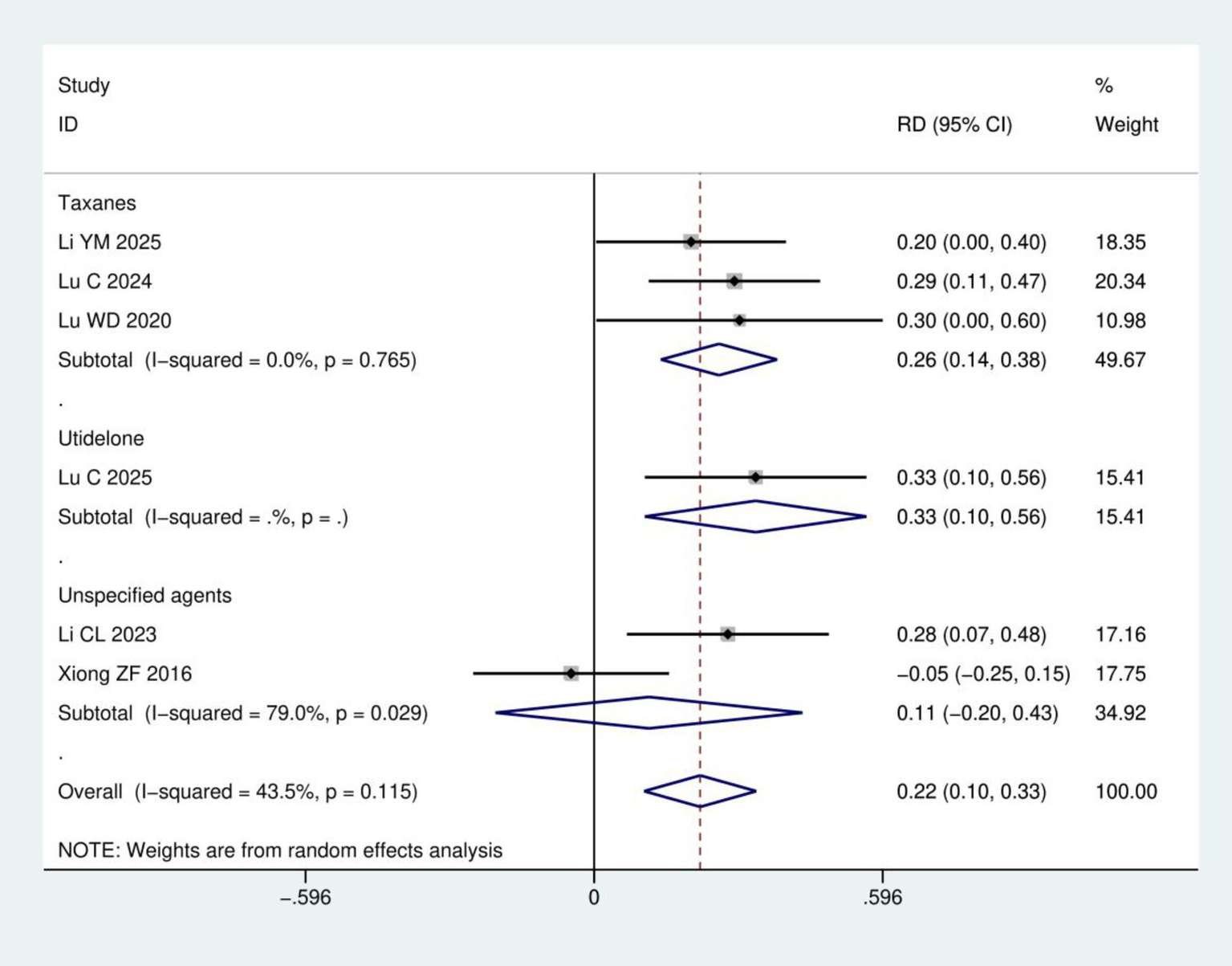 Clinical efficacy: A total of six RCTs (17, 18, 21–24) involving 428 patients were included in the clinical efficacy analysis (Figure 4). Based on the chemotherapeutic agents involved, the studies were categorized into three subgroups: taxanes, utidelone, and unspecified agents. Meta-analysis revealed a statistically significant improvement in the clinical efficacy for CIPN following acupuncture treatment group compared to control group (RD = 0.22, 95% CI: 0.10, 0.33; p < 0.001). Subgroup analysis according to chemotherapeutic drug class showed that acupuncture was significantly more effective than control for both the taxanes subgroup (3 studies; RD = 0.26, 95% CI: 0.14, 0.38; p < 0.001) and the utidelone subgroup (1 study; RD = 0.33, 95% CI: 0.10, 0.56; p = 0.004). For the unspecified agents subgroup (2 studies), the result favored acupuncture but did not reach statistical significance (RD = 0.11, 95% CI: −0.20, 0.43; p = 0.484). The efficacy ranking from highest to lowest was: utidelone-induced CIPN > taxane-induced CIPN > CIPN from unspecified agents.