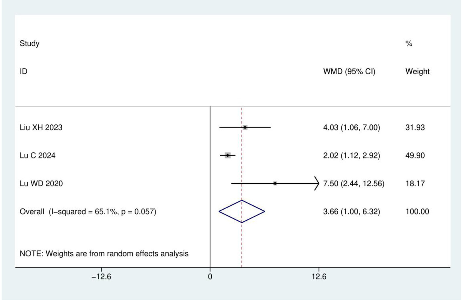 FACT-NTX: A total of three RCTs (19, 21, 23) were included, involving 233 patients. The results of heterogeneity analysis show I2 = 65.1% and p = 0.057. Therefore, a random effects model was used for analysis. Meta-analysis showed statistically significant difference between the acupuncture and control groups (WMD = 3.66, 95% CI: 1.00, 6.32; p = 0.007), as detailed in Figure 6.
