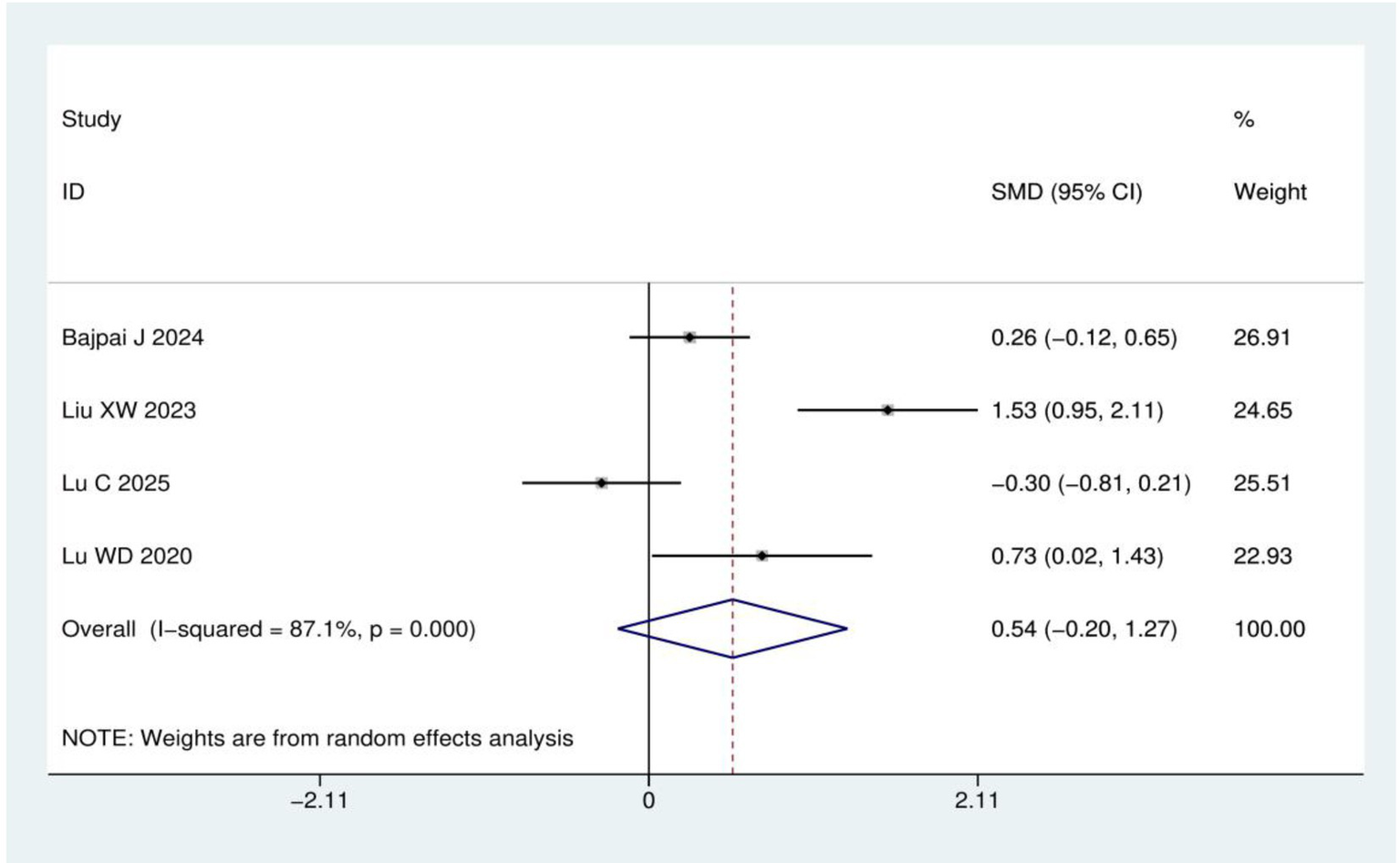 Quality of life score: A total of four RCTs (15, 20, 22, 23) involving 257 patients were included in the quality of life analysis using either the EORTC QLQ-C30 or EORTC QLQ-CIPN20 instruments. Heterogeneity analysis revealed I2 = 87.1% and p < 0.001, leading to the application of a random effects model. Meta-analysis demonstrated no statistically significant difference in quality of life scores between acupuncture group and control group (SMD = 0.54, 95% CI: −0.20, 1.27; p = 0.153), as shown in Figure 8.