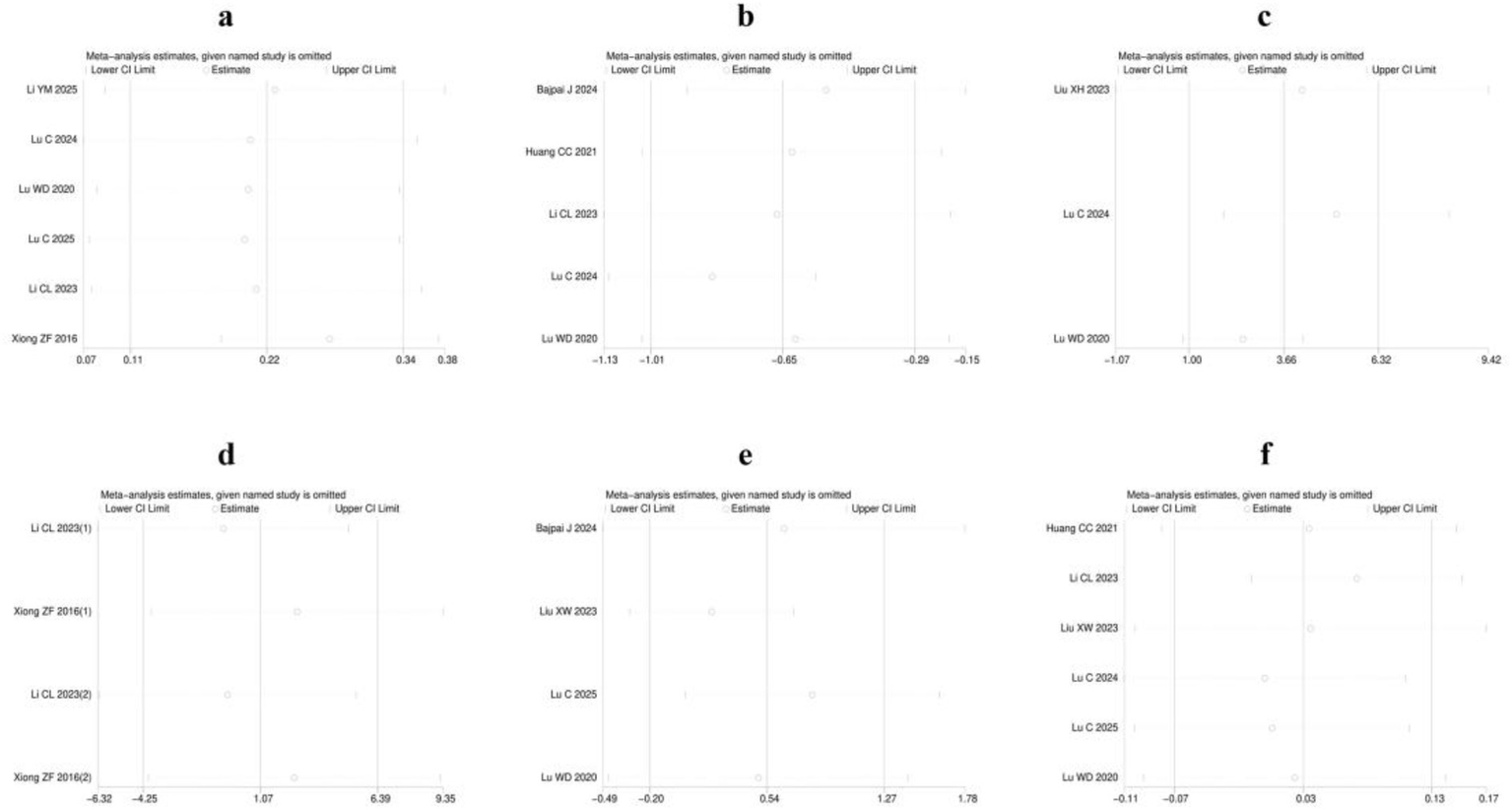 Sensitivity analysis: (a) Clinical efficacy; (b) Pain intensity; (c) FACT-NTX; (d) Nerve conduction velocity; (e) Quality of life score; (f) Incidence of adverse reactions.