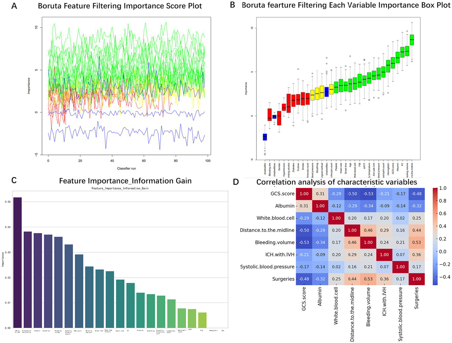 The present study retrospectively analysed the clinical data of 738 patients with sICH from two centres. In the feature selection process, the Boruta algorithm was initially employed for preliminary screening, and subsequently, the Information-Gain method was utilised to identify significant predictors. Following this, Spearman correlation analysis was implemented to eliminate collinearity between variables. During the model construction stage, the machine learning algorithm was optimized based on the internal test set, and the model performance was finally verified by the internal test set and the external validation set. In order to enhance the interpretability of the model, the SHapley Additive exPlanations (SHAP) method was used to visualize the prediction results.