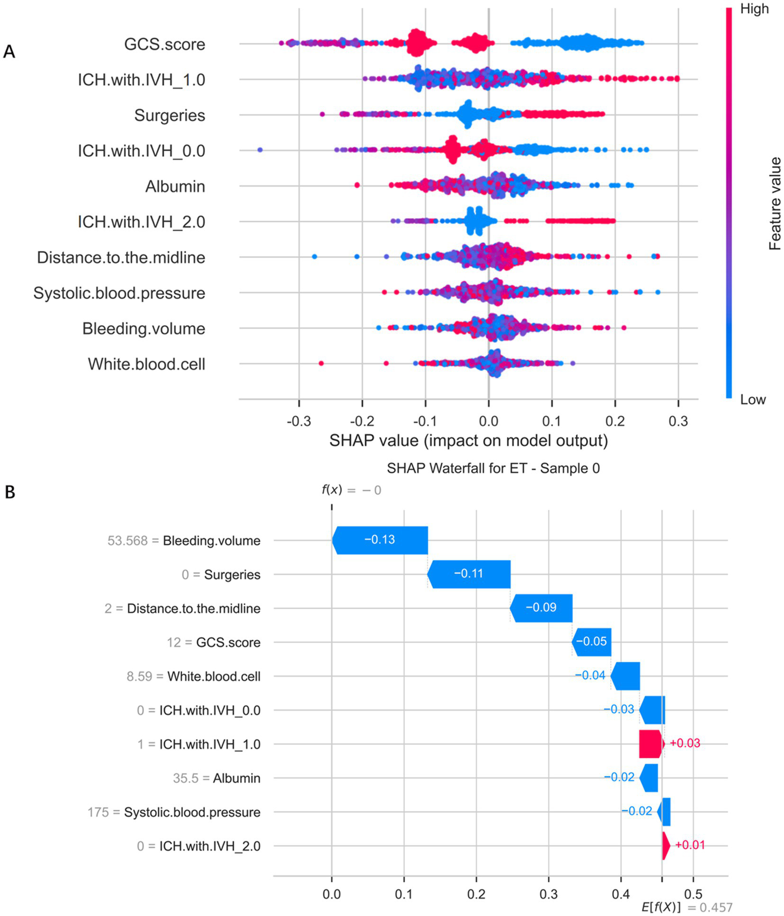 AUC, Area under the curve; DCA, Decision curve analysis; GIB, Gastrointestinal bleeding; GCS, Glasgow Coma Scale; ICH, Intracerebral hemorrhage; ICH with IVH, Intraventricular extension of hemorrhage; ROC, Receiver operating characteristic; sICH, Spontaneous intracerebral hemorrhage; SU, Stress ulcer; SHAP, SHapley Additive exPlanations.