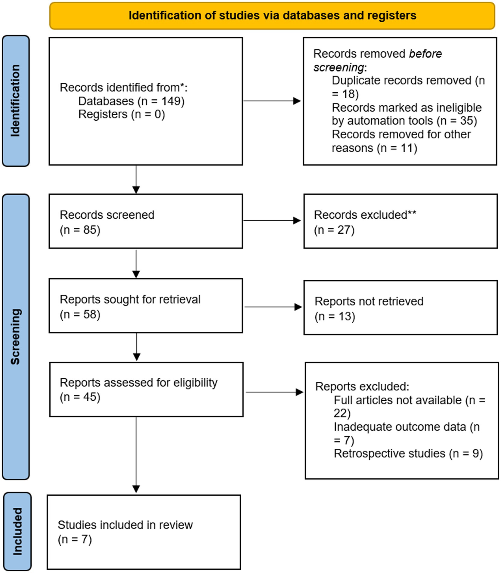 In total, 149 records were identified. After duplicate removal and eligibility assessment, seven RCTs met the inclusion criteria and were included in the final quantitative synthesis (Figure 1).
