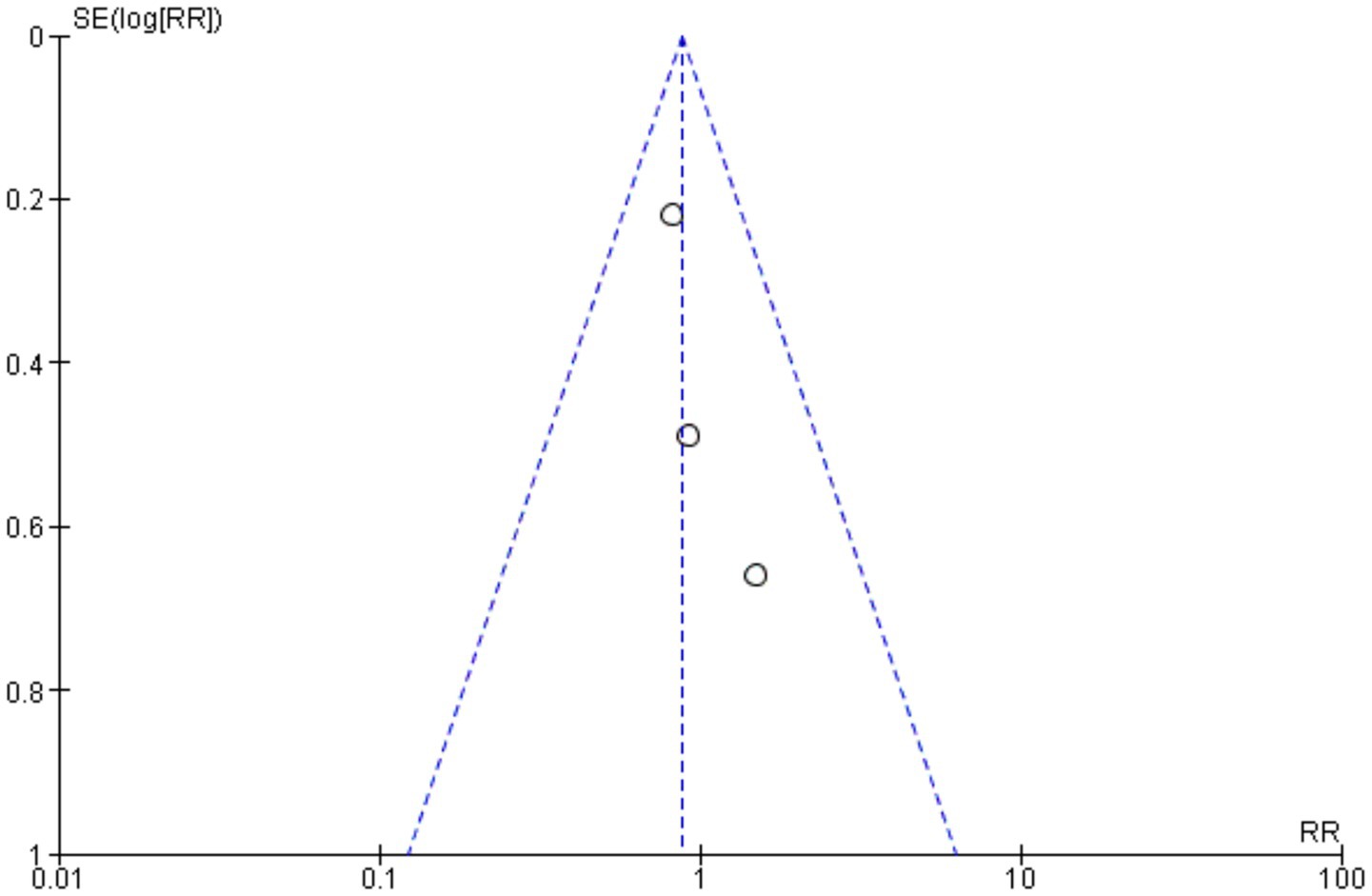 Examining the distribution of studies according to their effect sizes, risk ratios, and standard deviations in the funnel plot showed the possible publication bias in the meta-analysis. Suggesting no influence (RR = 1), the symmetric distribution around the vertical line pointed to a minimal possibility of publication bias. The asymmetry, however, pointed to the existence of small-study effects, that is, those whereby research with smaller sample sizes exhibited higher variability in their findings (Figure 2). Low risks for random sequence generation and allocation concealment exposed variations in research quality, as shown by bias assessment, and high risks were observed for selective reporting and performance bias (Figure 3).