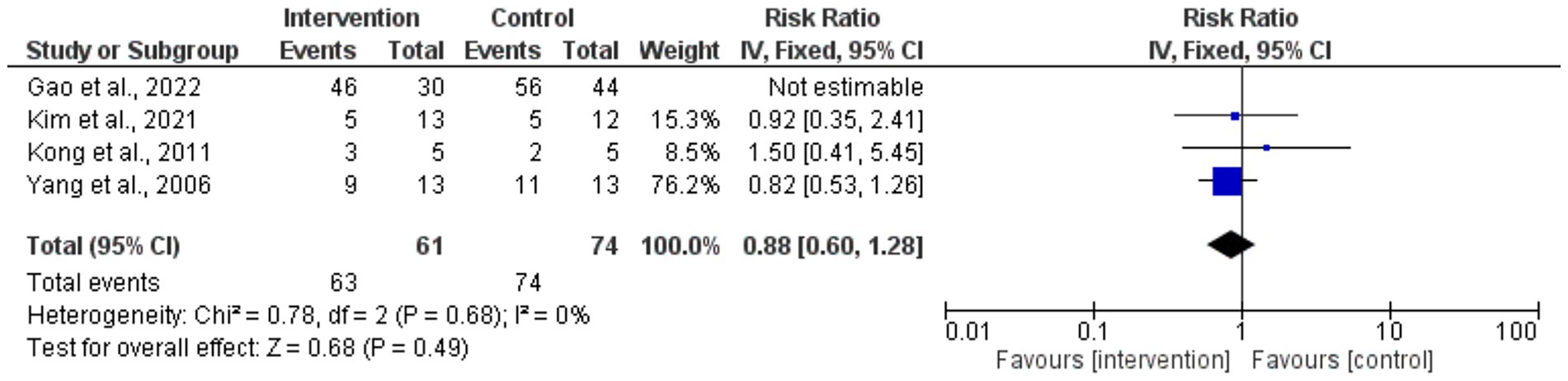 These outcomes were selected based on their clinical relevance and frequency of reporting across the included randomized controlled trials. Effect estimates were calculated using risk ratios (RRs) and 95% confidence intervals (CIs) for dichotomous variables, and mean differences for continuous variables.