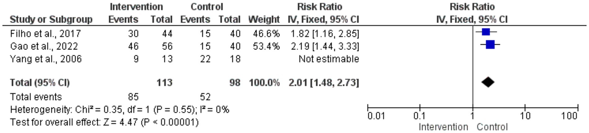 Because the Gao et al. (19) study (n = 140) contributed 72% of the total sample size, a sensitivity analysis was conducted to assess the potential dominance of this single study. When all seven studies were included, the pooled risk ratio (RR) for improvement in visual acuity was 2.01 (95% CI: 1.48–2.73) with I2 = 0%, indicating low heterogeneity. After excluding Gao (2022), the pooled RR was 1.82 (95% CI: 1.21–2.74), and heterogeneity remained low (I2 = 0%). These results confirm that the primary findings of this meta-analysis are robust and not unduly influenced by the largest single study.