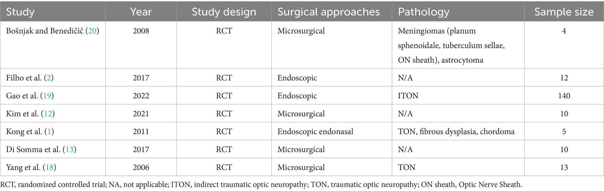 The variation in patient demographics, outcome assessments, and follow-up times complicated the data pooling and made accurate quantitative analysis challenging in this meta-analysis. Well-designed RCTs directly comparing surgical approaches in clinically relevant settings should take front stage in future studies. Standardizing definitions of visual progress and including objective assessments such as VEP would help to improve comparability between studies.