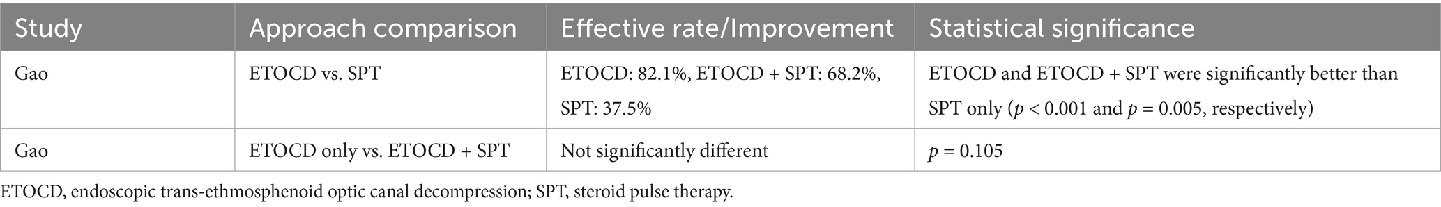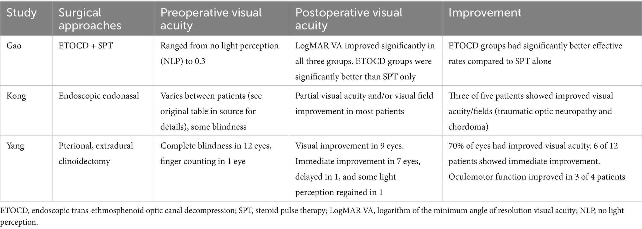 Although anatomical variations exist, the therapeutic effectiveness of these techniques remains controversial. Yang et al. (18) reported a 70% visual acuity improvement rate in patients undergoing transcranial decompression, underscoring its value in treating difficult intracranial pathologies. Gao et al. (19) reported an 82% visual improvement rate with ETOCD alone, which decreased to 68% when combined with steroid pulse therapy, compared with only 38% improvement in the steroid-only group (3). These findings suggest that surgical decompression is the primary contributor to visual recovery, while the added value of adjunctive steroid therapy remains uncertain and warrants further investigation (7, 19).