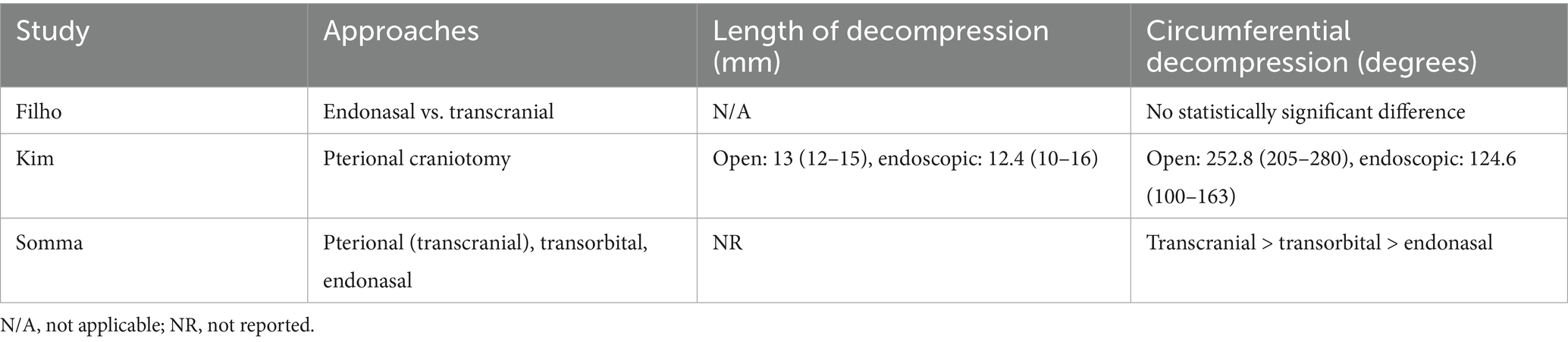 Focusing on visual outcomes and the degree of decompression, this meta-analysis analyzed data from research trials examining the efficacy of various surgical techniques for optic nerve decompression. The techniques addressing both traumatic and non-traumatic ocular neuropathies include ETOCD, pterional craniotomy with extradural anterior clinoidectomy, and transorbital approaches (2, 12). Studies emphasized two main surgical routes: the transcranial approach and the endonasal approach. Superior circumferential decompression of the optic canal was achieved using the transcranial method, which involved a pterional craniotomy with anterior clinoidectomy. Using the transcranial method (252.8° and 245.2°, respectively), Kim et al. (12) and Di Somma et al. (13) observed significantly higher circumferential bone removal than with the endonasal approach (124.6° and 144.6°, respectively). Di Somma et al. (13) further showed that the transcranial approach provided a surgical freedom area of 10.9 cm2, far more than the 1.1 cm2 attainable with the endonasal approach. This approach is particularly advantageous for managing complicated diseases involving the optic strut and anterior clinoid process, where wider decompression is typically required to maximize visual outcomes (13, 14).