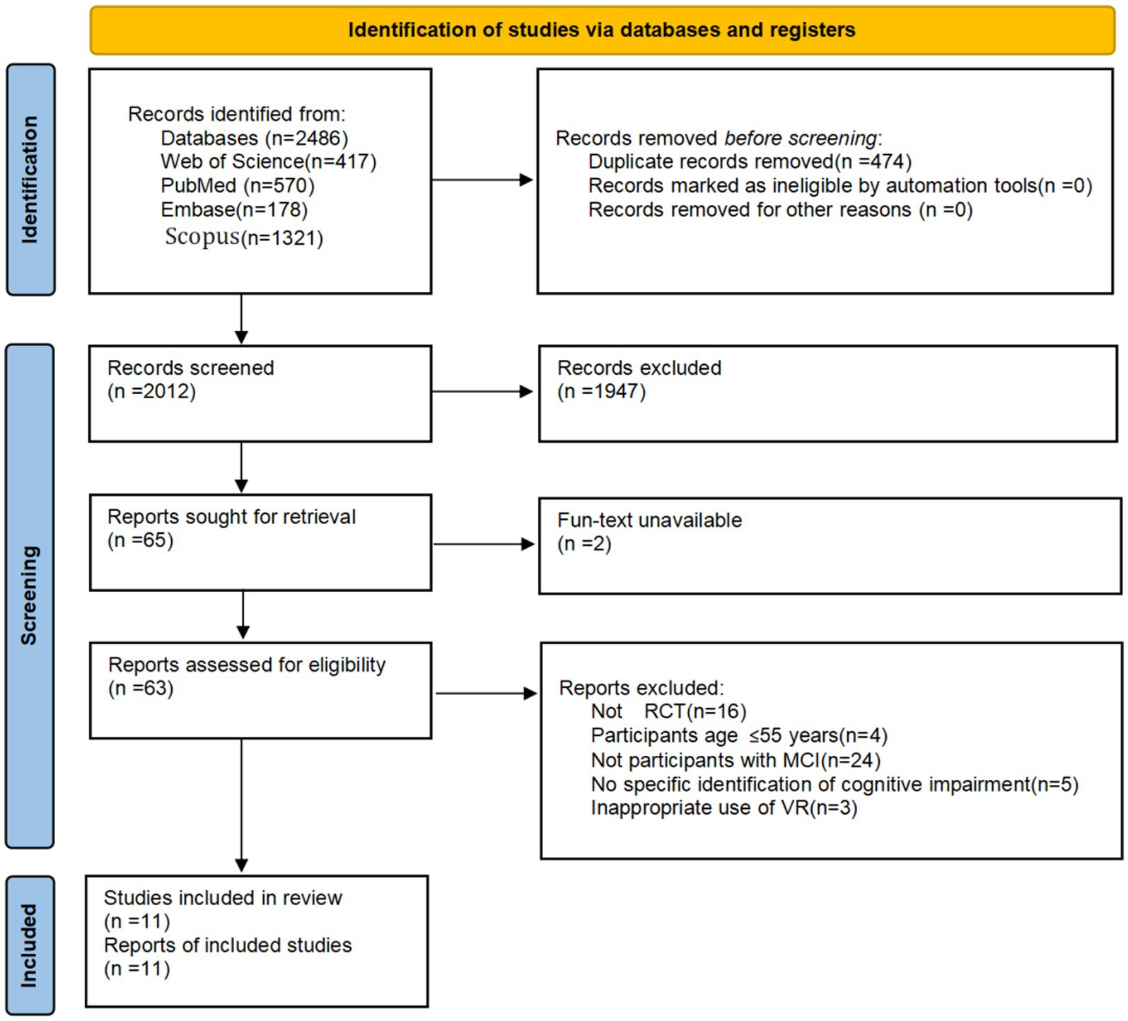 A total of 2,486 papers were identified using the four databases, of which 474 were duplicates. Each of these studies underwent a rigorous and meticulous review, during which inclusion and exclusion criteria were carefully applied. The assessment process involved a thorough examination of the methodologies, results, and relevance to the research focus. After this meticulous screening, 11 articles that met the inclusion criteria were finally selected. The detailed process of this screening is as follows Figure 1.