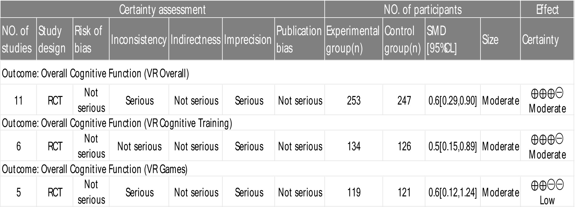 According to the GRADE assessment, the certainty of evidence regarding the effect of VR interventions on overall cognitive function in patients with MCI was rated as moderate. This judgment was based on a balance of downgrading and upgrading factors. The evidence was downgraded due to substantial heterogeneity (I2 = 64.69%) and imprecision resulting from a limited sample size and wide confidence intervals. However, it was upgraded based on a significant dose–response relationship identified in the meta-regression analysis, wherein a higher level of VR immersion was positively correlated with greater cognitive improvement (β = 0.834, p < 0.05). In subgroup analyses, the certainty of evidence was moderate for VR-based cognitive training but low for VR-based gaming. The latter was further downgraded to low certainty within its subgroup, primarily owing to considerable heterogeneity and more severe imprecision (as indicated by extremely wide confidence intervals; Figure 3).