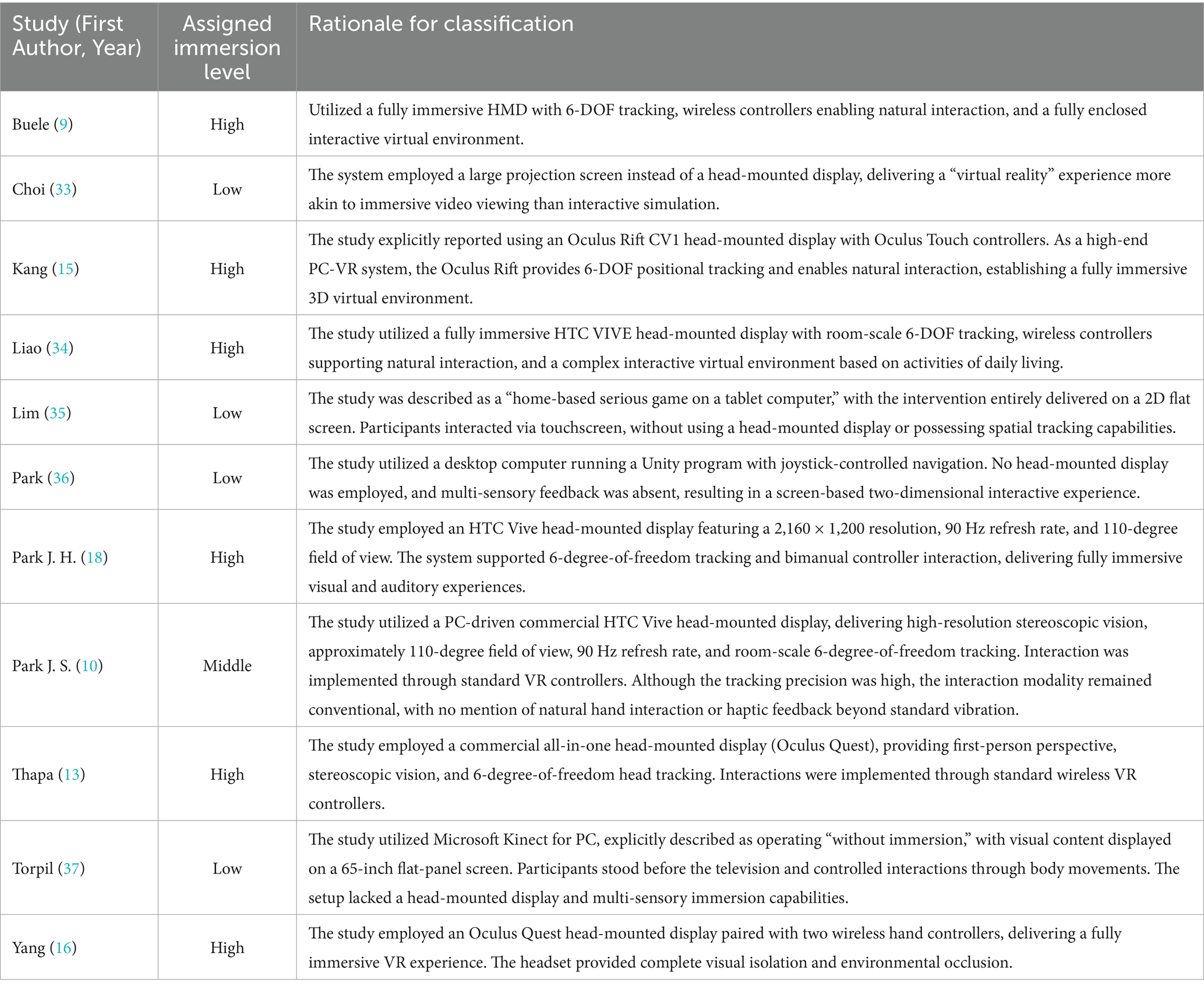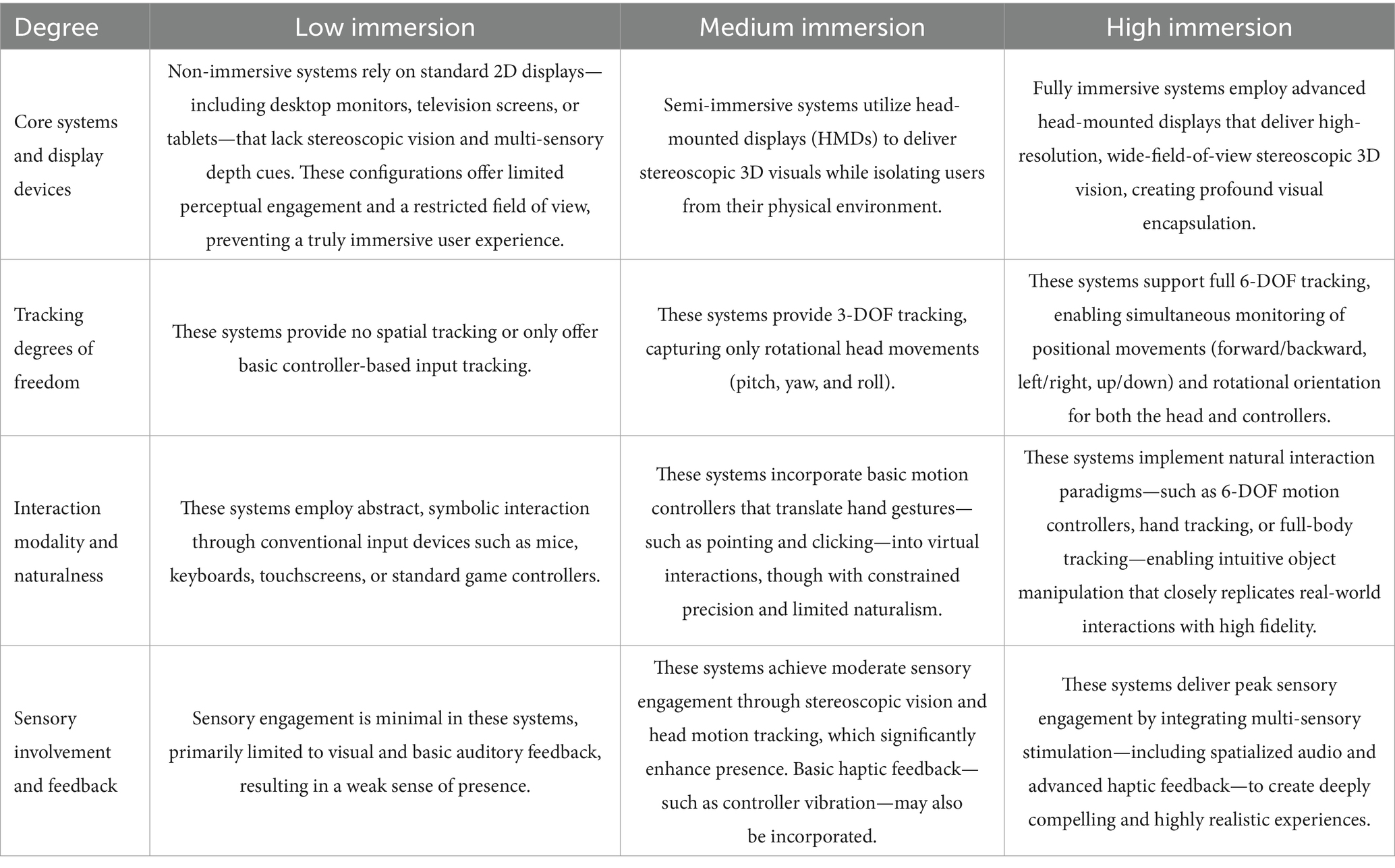 Based on specific technical specifications—including stereoscopy, 3/6-DOF tracking, natural interaction paradigms, and advanced features such as haptic feedback—we established operational criteria to classify immersion into three distinct levels: Low, Moderate, and High (24, 25). Details in Table 1.