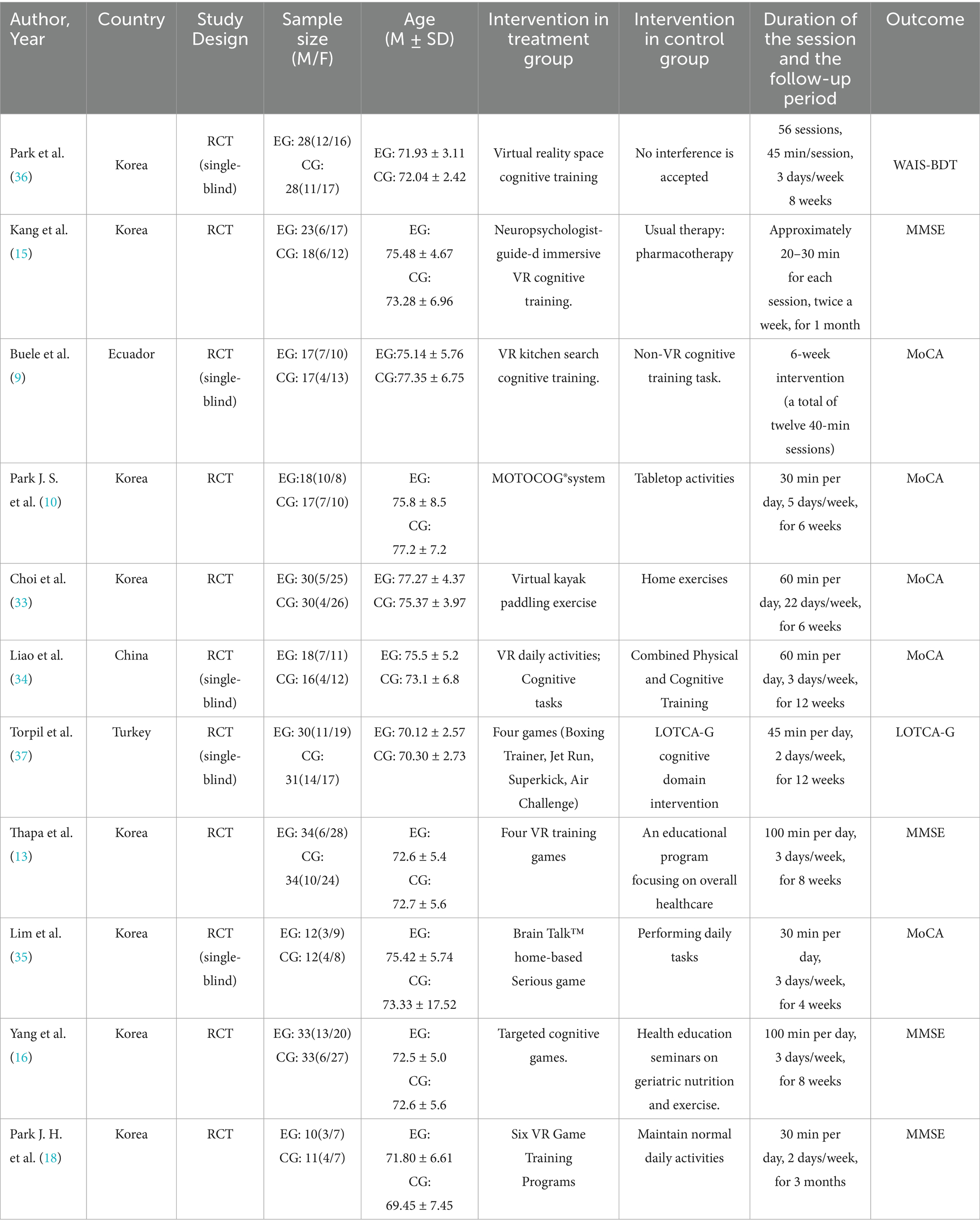 A total of 11 studies were included, among which 8 were conducted in South Korea, and the remaining 3 were carried out in China, Turkey, and Ecuador. All included studies focused on elderly individuals with mild cognitive impairment (MCI). Regarding interventions for cognitive rehabilitation in MCI patients, 6 studies adopted VR-based cognitive training, such as spatial cognitive training, simulated shopping activities, and virtual kayaking paddling exercises; the other 5 studies utilized VR-based games, including Seek a Song of Our Own, Fireworks Party, and Boxing Trainer. In one of the articles, no intervention was implemented in the control group, while other studies applied interventions such as conventional training or a combination of cognitive training and physical activities. The characteristics of the included articles were presented in Table 2. This study further establishes a systematic classification of immersion levels across all included studies, with clearly defined criteria based on specific hardware capabilities and interactive features. The detailed classification framework is presented in Table 3.
