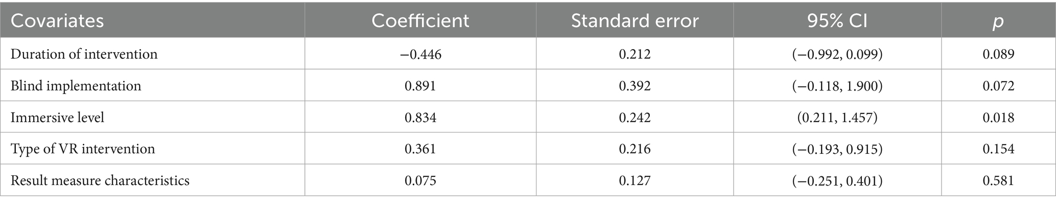 Meta-regression analysis identified the level of VR immersion as a statistically significant and positive moderator of cognitive improvement (coefficient β = 0.834, 95% CI: 0.211 to 1.457, p < 0.05), indicating that each unit increase in immersion level (e.g., from “low” to “medium” or “medium” to “high”) was associated with an average 0.834 increase in effect size (Table 4). In contrast, the analysis revealed that while intervention duration (p = 0.089) and blinding implementation (p = 0.072) did not reach conventional statistical significance thresholds, their coefficient estimates and confidence intervals suggested meaningful effect sizes approaching significance. These findings indicate potential moderating trends that merit examination in future studies with larger sample sizes. Other covariates, including VR intervention type and outcome measurement characteristics, demonstrated no appreciable relationship with effect size (p > 0.15), supporting their exclusion as substantive moderators in the current data set (Table 4).