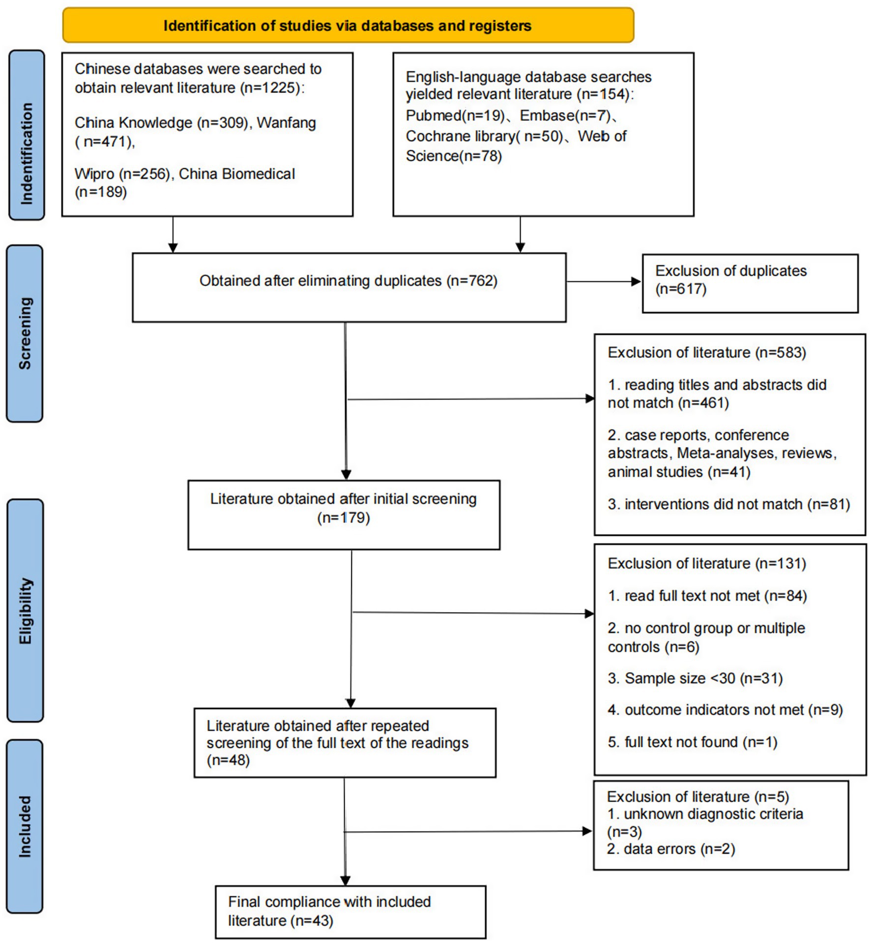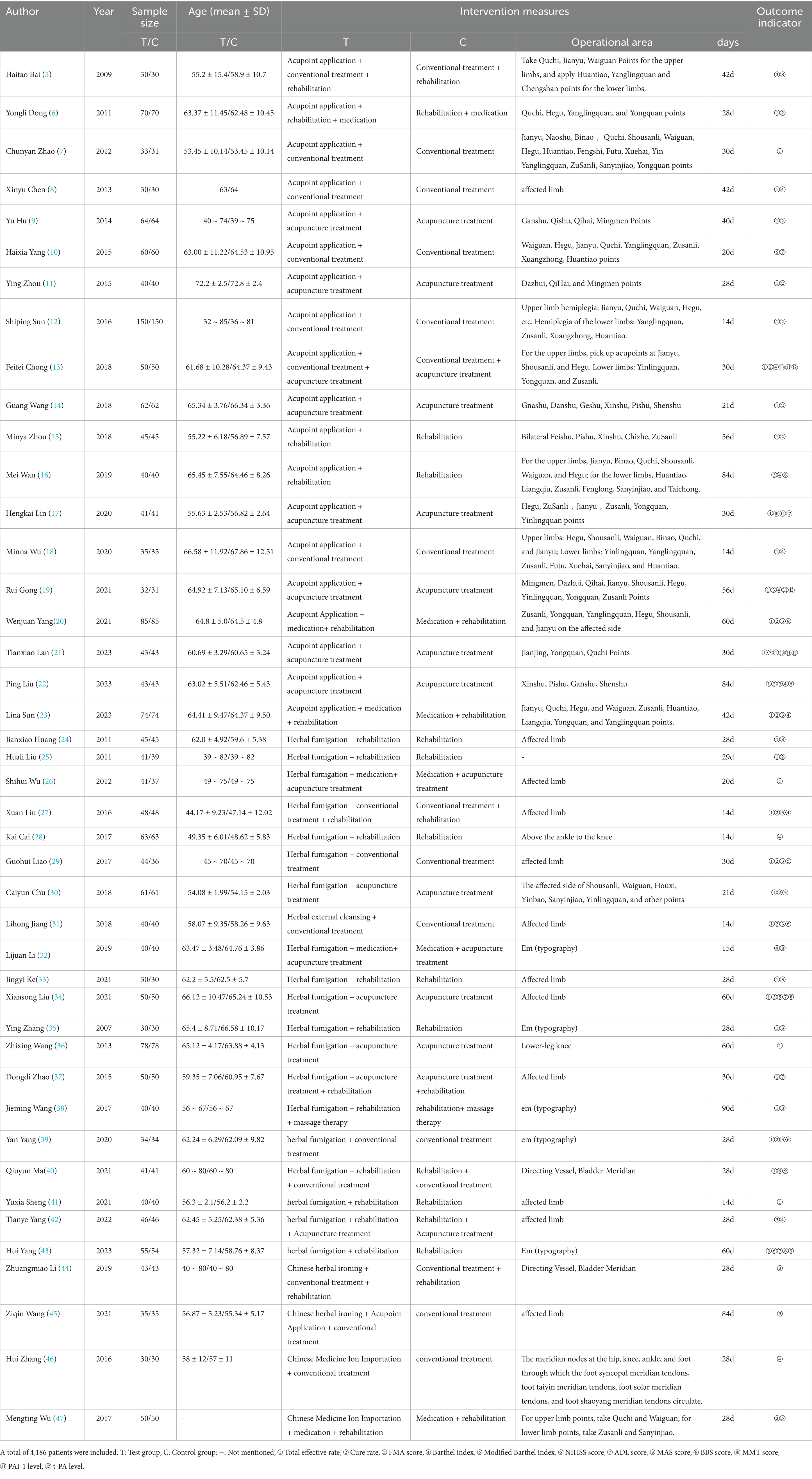 The search identified 1,379 records. After deduplication, 617 unique records remained. Title and abstract screening excluded 583 articles. Full-text review of 179 articles, and then the full text of the remaining literature was intensively read, and a total of 131 pieces of literature that did not meet the inclusion criteria were excluded, and 43 pieces of literature were ultimately included (5–47). The screening process and results are shown in Figure 1. A total of 4,186 subjects were included in the 43 papers, and the basic characteristics of the included papers are shown in Table 3. In terms of specific interventions: 19 studies used acupoint application, 10 used TCM fumigation, 9 used TCM washing/fuming, and 2 used TCM intermediate-frequency iontophoresis. In terms of the intervention period, 11 studies chose 4 weeks of intervention, 3 studies chose 6 weeks of intervention, and 6 studies chose 2 weeks of intervention. The results of the included literature showed that there was no significant difference in the index scores of the two groups of patients before treatment (p > 0.05); the index scores of the two groups of patients after treatment showed that the therapeutic effect was better than before treatment, and the therapeutic effect of the experimental group was better than the level of the control group, with a significant difference (p < 0.05).