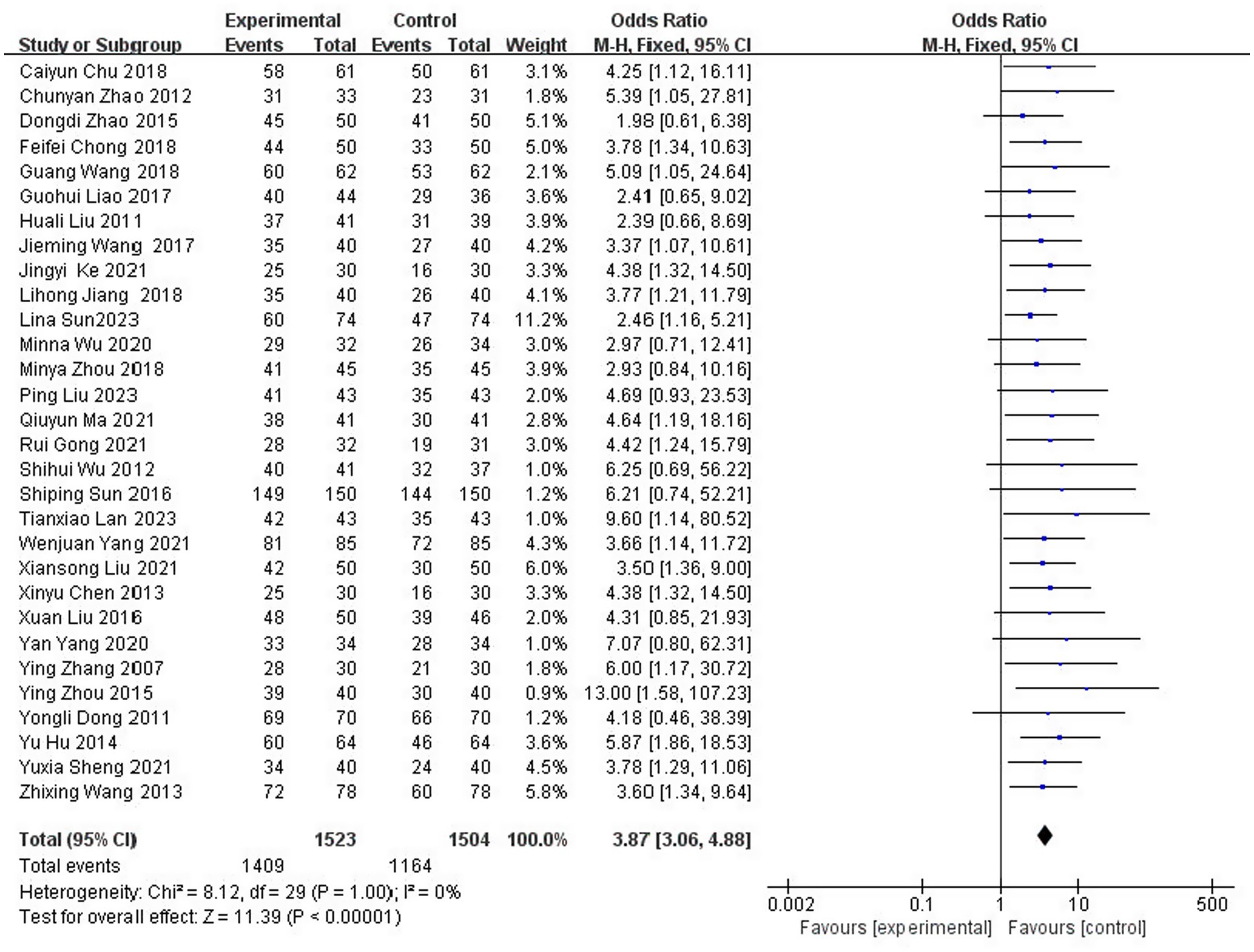 A total of 30 studies (6–9, 11–15, 18–23, 25–27, 29–31, 33–41) were included to report the total clinical effective rate after treatment, involving 3,027 patients (accounting for 72.3% of the total 4,186 patients included in this meta-analysis), of which 1,523 patients in the experimental group were effective in 1,409 cases, and 1,504 patients in the control group were effective in 1,164 cases. The 3,027 patients included in this specific analysis represent a subset of the total 4,186 patients from the included studies. The inclusion criteria for this outcome were based on studies that explicitly reported dichotomous data for treatment effectiveness (cured, markedly effective, effective, and ineffective), allowing for the calculation of the total effective rate. Heterogeneity was low (I2 = 0%, p = 1.00), so FEM was used. TCM external application significantly increased the total effective rate [OR = 3.87, 95% CI: (3.06, 4.88), p < 0.00001] (Figure 4).