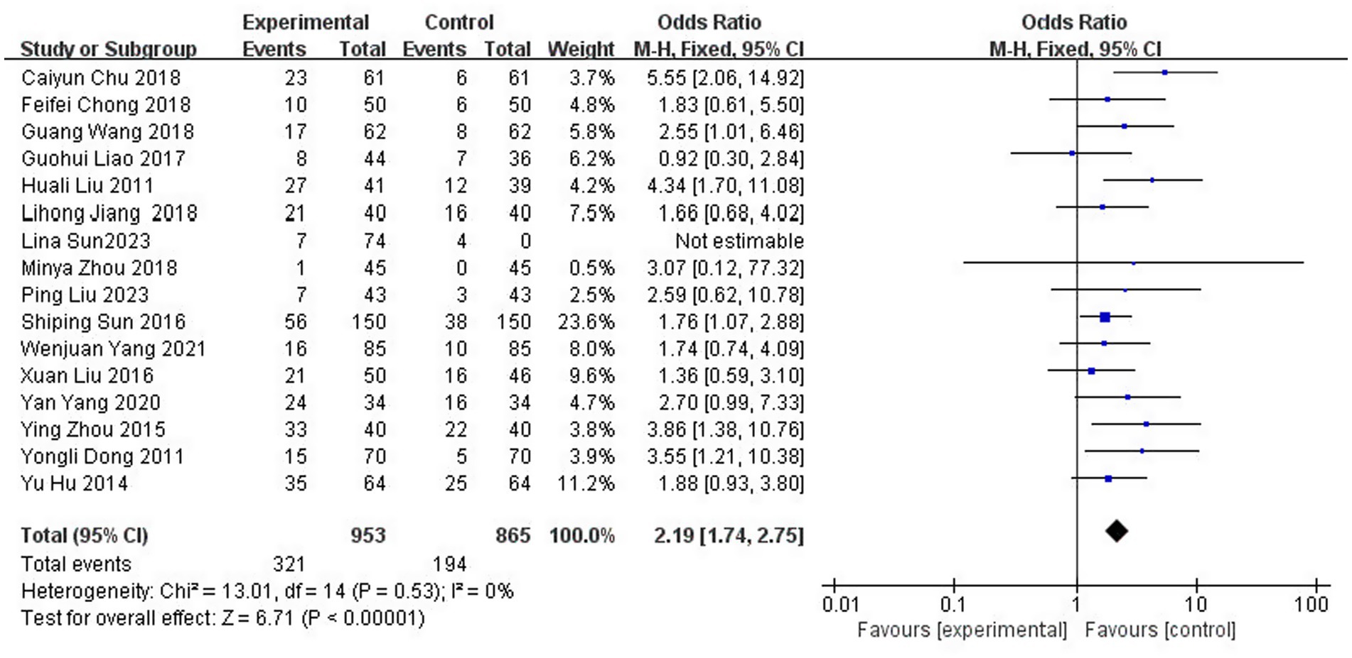 A total of 16 studies (6, 9, 11–15, 20, 22, 23, 25, 27, 29–31, 39) reported the clinical cure rate after treatment, involving 1,818 patients (43.4% of the total 4,186 patients), of which 953 patients in the experimental group were cured in 321 cases and 865 patients in the control group were cured in 194 cases. The results of the heterogeneity test (I2 = 0%, p = 0.53) suggested homogeneity among the selected literature for this study, and FEM was chosen for meta-analysis. The cure rate was significantly higher in the test group [OR = 2.19, 95% CI: (1.74, 2.75)] (Figure 5).