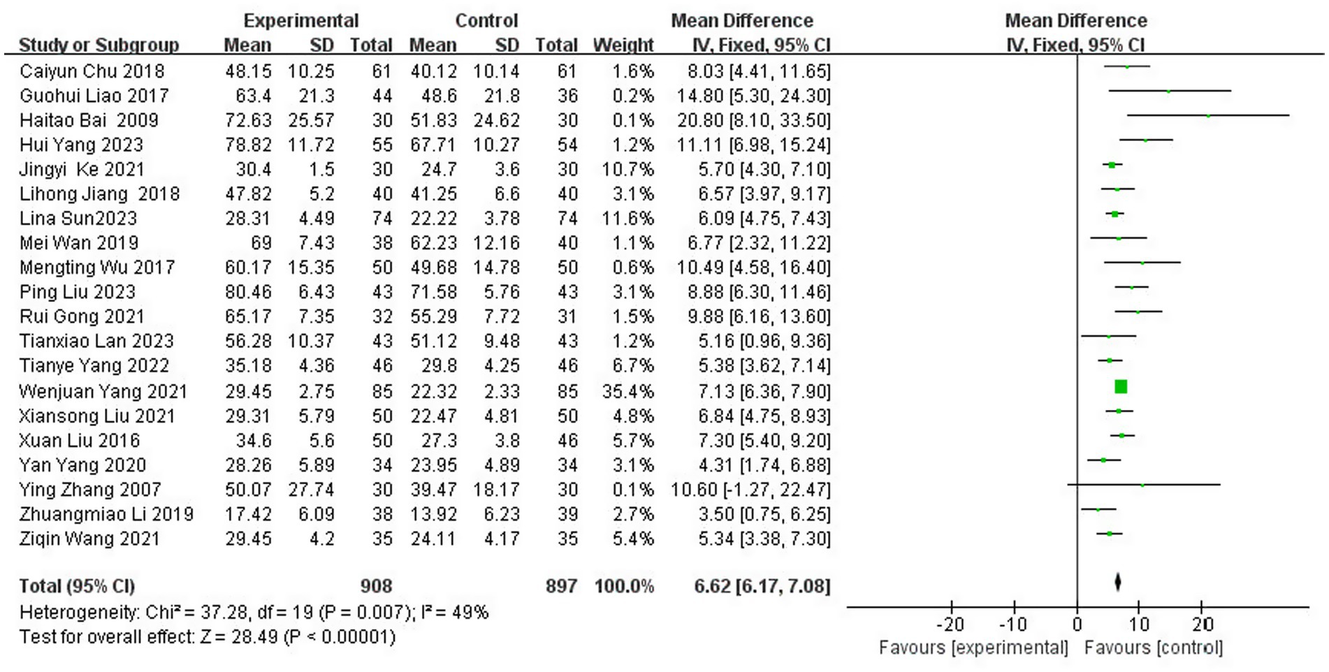 A total of 20 studies (5, 16, 19–23, 27, 29–31, 33–35, 39, 42–45, 47) reported the Fugl-Meyer Motor Function Score (FMA) scores after treatment, which involved 1,805 patients (representing 43.1% of the total 4,186 patients), of which 908 patients were in the experimental group and 897 patients were in the control group. The results of the heterogeneity test (I2 = 49%, p = 0.01) indicated moderate heterogeneity among the included studies; consequently, FEM was chosen for meta-analysis. The results showed that compared with the control group, the application of herbal topical medicine significantly improved the patients’ Fugl-Meyer motor function score (FMA) [MD = 6.62, 95% CI: (6.17, 7.08), p < 0.00001] (Figure 6).