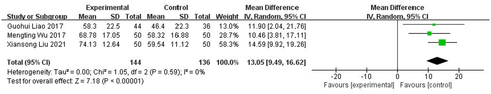 A total of three studies (29, 34, 47) reported on the ability to perform daily living assessment (Modified Barthel Index Score), with a total of 280 patients, including 144 in the test group and 136 in the control group. The results of the heterogeneity test (I2 = 0%, p = 0.59) suggested homogeneity among the selected literature for this study, and FEM was chosen for meta-analysis. The results showed that the application of topical herbal medicine significantly improved the MBI scores of patients compared with the control group [MD = 13.05, 95% CI: (9.49, 16.62), p < 0.00001] (Figure 8).