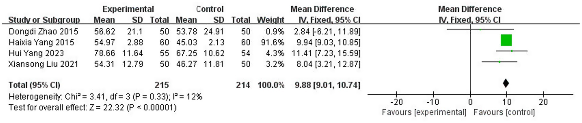 A total of four studies (10, 34, 37, 43) reported ADL scores with 429 patients, including 215 in the experimental group and 214 in the control group. The results of the heterogeneity test (I2 = 12%, p = 0.33) suggested homogeneity among the selected literature for this study, and FEM was chosen for meta-analysis. The results showed that the application of topical herbal medicine significantly improved patients’ ADL scores compared with the control group [MD = 9.88, 95% CI: (9.01, 10.74), p < 0.00001] (Figure 9).