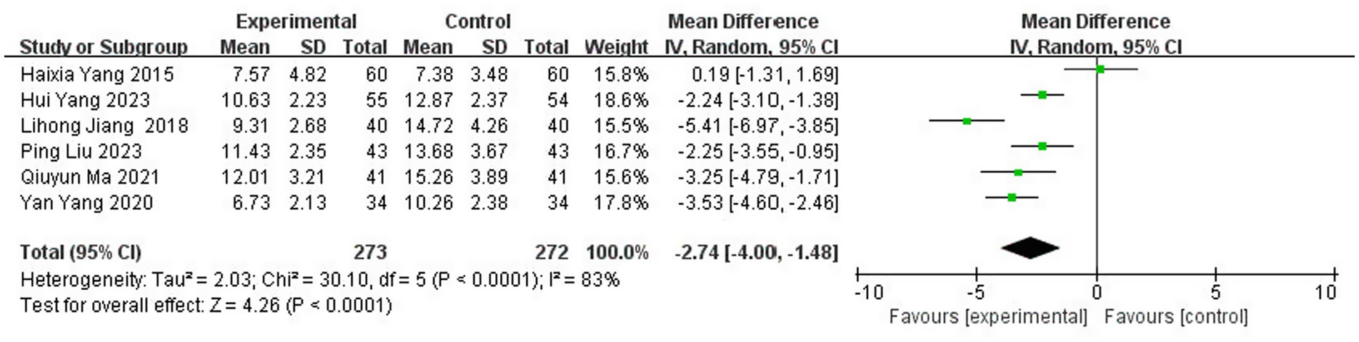 A total of six studies (10, 22, 31, 39, 40, 43) reported the NIHSS scores after treatment, involving 545 patients (13.0% of the total 4,186 patients), including 273 patients in the test group and 272 patients in the control group. The initial overall heterogeneity test indicated substantial heterogeneity (I2 = 83%, p < 0.00001), necessitating the use of a random effects model (REM) for the primary meta-analysis (Figure 10).
