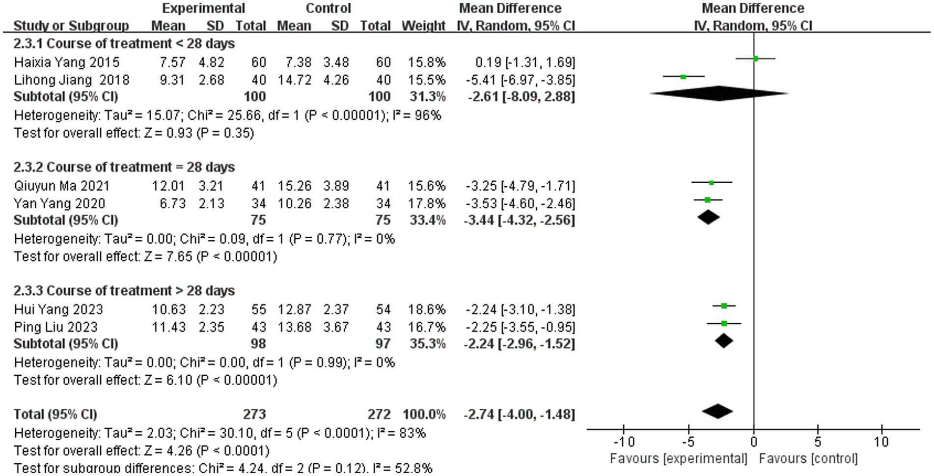 In contrast, both the standard-term group (=28 days, 2 studies (39, 40); MD = −3.44 [95% CI: −4.32, −2.55]) and the extended-term group (>28 days, 2 studies (22, 43); MD = −2.24 [95% CI: −2.96, −1.52]) demonstrated statistically significant benefits and, crucially, perfect homogeneity (I2 = 0% for both).
