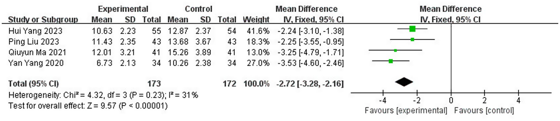 Upon their exclusion, the heterogeneity among the remaining four studies dropped substantially from I2 = 83% to I2 = 31% (p = 0.23), confirming that these two studies were the major contributors to the initial statistical inconsistency. With low residual heterogeneity, a fixed effect model (FEM) was appropriate. This more robust analysis yielded a precise and statistically significant result: the application of traditional Chinese medicine topical method significantly reduced neurological deficit scores [MD = −2.72, 95% CI: (−3.28, −2.16), p < 0.00001] (Figure 12).