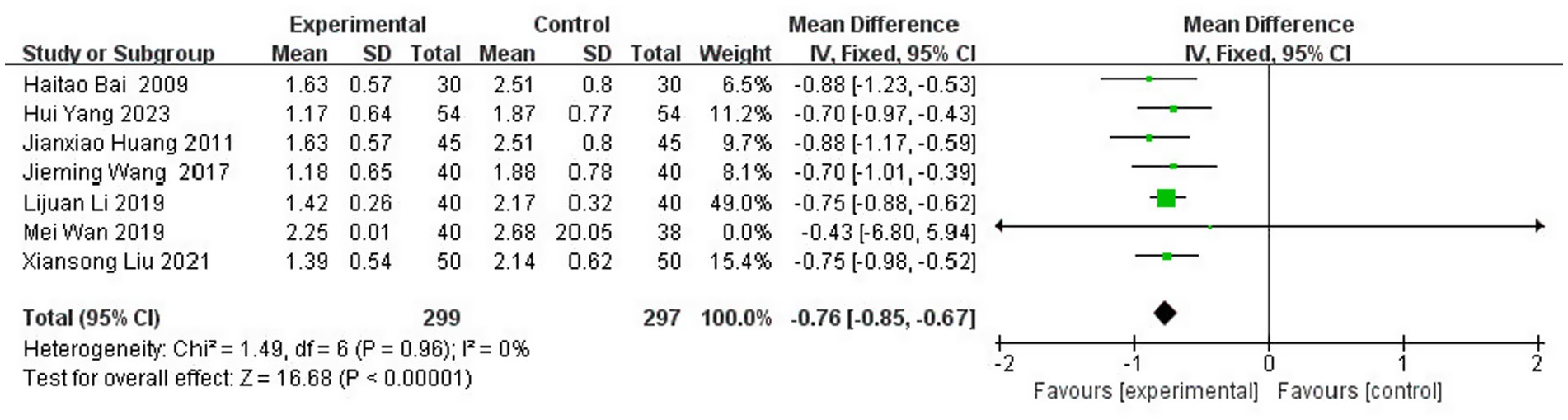 A total of seven studies (5, 16, 24, 32, 34, 38, 43) reported the MAS scores after treatment, involving 596 patients (14.2% of the total 4,186 patients), including 299 patients in the experimental group and 297 patients in the control group. The results of the heterogeneity test (I2 = 0%, p = 0.96) suggested homogeneity among the literature selected for this study, and FEM was chosen for meta-analysis. The results showed that compared with the control group, the application of topical Chinese medicine could significantly reduce the degree of neurological deficits in patients [MD = -0.76, 95% CI: (−0.85, −0.67), p < 0.00001] (Figure 13).