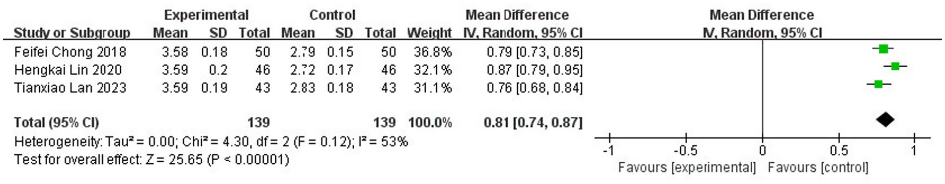 A total of three studies (13, 17, 21) reported treated MMT scores involving 278 patients (6.6% of the total 4,186 patients), including 139 patients in the test group and 139 patients in the control group. The overall heterogeneity test showed significant heterogeneity (I2 = 53%, p = 0.12), prompting the use of a random effects model (REM) for the primary meta-analysis. The initial results indicated that compared with the control group, the application of herbal topical medicine could significantly improve patients’ MMT scores [MD = 0.81, 95% CI: (0.74, 0.87), p < 0.00001] (Figure 15).