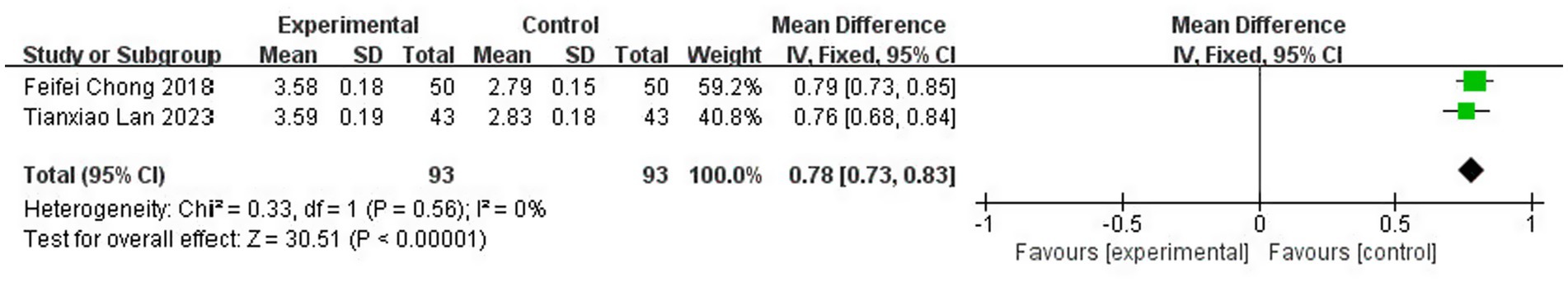 A fixed effect model (FEM) was then applied to the two homogeneous studies, yielding a result that remained highly statistically significant [MD = 0.78, 95% CI (0.73, 0.83), p < 0.00001]. (Figure 16). Crucially, the point estimate of 0.78 is very close to the initial estimate of 0.81, demonstrating that while the heterogeneity was real and traceable, it did not fundamentally alter the primary conclusion regarding the efficacy of the intervention. This strengthens the overall finding by showing that a consistent, significant treatment effect exists across a more homogeneous subset of the evidence.