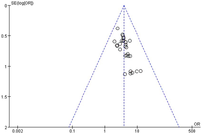 Visual inspection of the funnel plot (Figure 19) revealed pronounced asymmetry, with a notable absence of small-scale studies exhibiting null or negative findings in the lower-left quadrant. This pattern is suggestive of a potential bias against the publication of smaller, non-significant studies.
