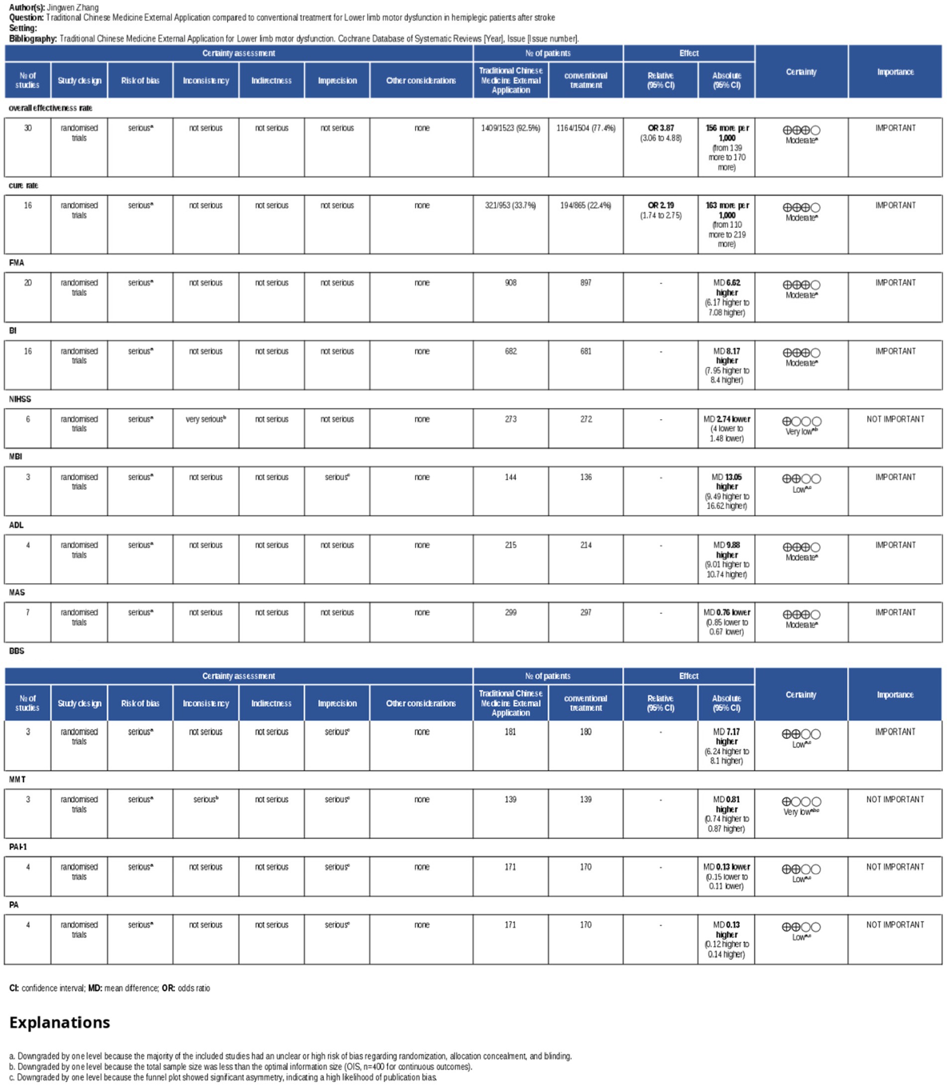Conclusion: External application of traditional Chinese medicine has significant efficacy and safety in the treatment of lower limb dysfunction after stroke. Potential mechanisms of action are also discussed.