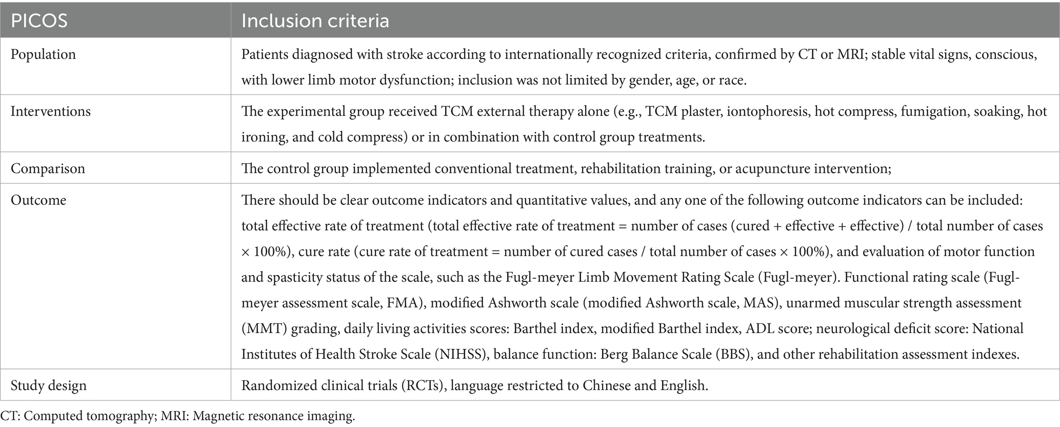 In the book “LiYuePianWen,” it is mentioned that “the theory of external treatment is the theory of internal treatment, and the medicine of external treatment is the medicine of internal treatment, and the difference is the law. There is no difference in the method of healing, but the method is magical.” This highlights that external and internal treatments in TCM share the same theoretical foundation, differing primarily in their routes of administration (4). The external use of Chinese medicine, such as Chinese medicine fumigation, Chinese medicine wet heat compress, Chinese medicine patch, etc., occupies an important position in traditional Chinese medicine therapies. These therapies are administered through the skin, mucous membrane, and other routes, aiming to promote local blood circulation, relieve muscle tension, improve nerve function, etc., and thus may have some therapeutic effects on post-stroke hemiparesis. In recent years, the external treatment of traditional Chinese medicine has demonstrated unique advantages in the treatment of post-stroke hemiplegia and has become a research hotspot. Thus, a meta-analysis to systematically evaluate the efficacy of TCM external therapy for lower limb dysfunction in this population is of considerable significance.
