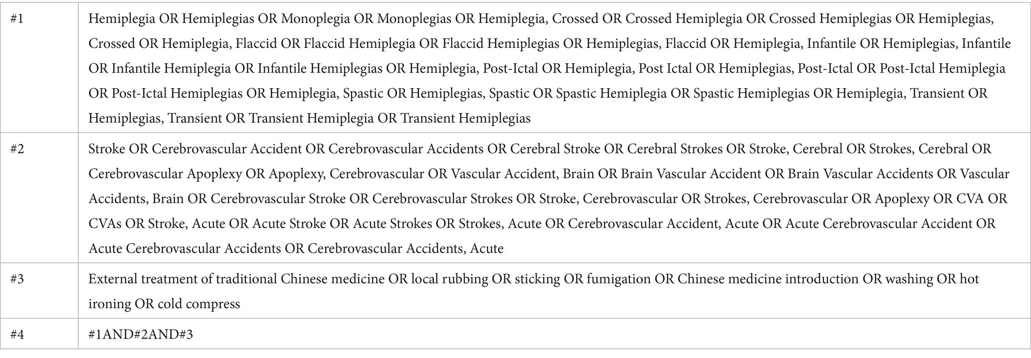 Several Chinese and English databases were searched by computer, and CNKI, China Biomedical Literature Service (CBM), Wipo, and Wanfang databases were used for literature collection in Chinese, while Pubmed, Embase, Web of Science, and Cochrane Library were used for foreign literature collection, to collect information about the intervention of Chinese herbal medicines in hemiplegia after stroke. Randomized controlled trials (RCTs) on the intervention of external use of traditional Chinese medicine in lower limb dysfunction in patients with hemiplegia after stroke were collected. The search timeframe was usually from database construction to 15 October 2024 to ensure inclusion of the most recent research results. To identify studies relevant to the purpose of the meta-analysis, we searched using a comprehensive set of search terms, including (1) “stroke” or “cerebrovascular accident” or “cerebral stroke” or “Cerebral infarction” or “Cerebral embolism” or “Cerebral ischemia” or “Ischemic encephalopathy,” (2) “hemiplegia” or “lower extremity muscle strength” or “muscle tone,” and (3) “External application of traditional Chinese medicine” or “patch” or “fumigation” or “Foaming” or “Hot ironing.” The search terms were based on keywords rather than MeSH terms to increase the sensitivity of the database search. However, comparisons were made with MeSH search terms before the database search to ensure that all relevant MeSH search terms were included in the search. Retrieval formulations were developed using logical characters, wildcards, range operators, etc. Taking the PubMed database as an example, the detailed search strategy is shown in Table 2.