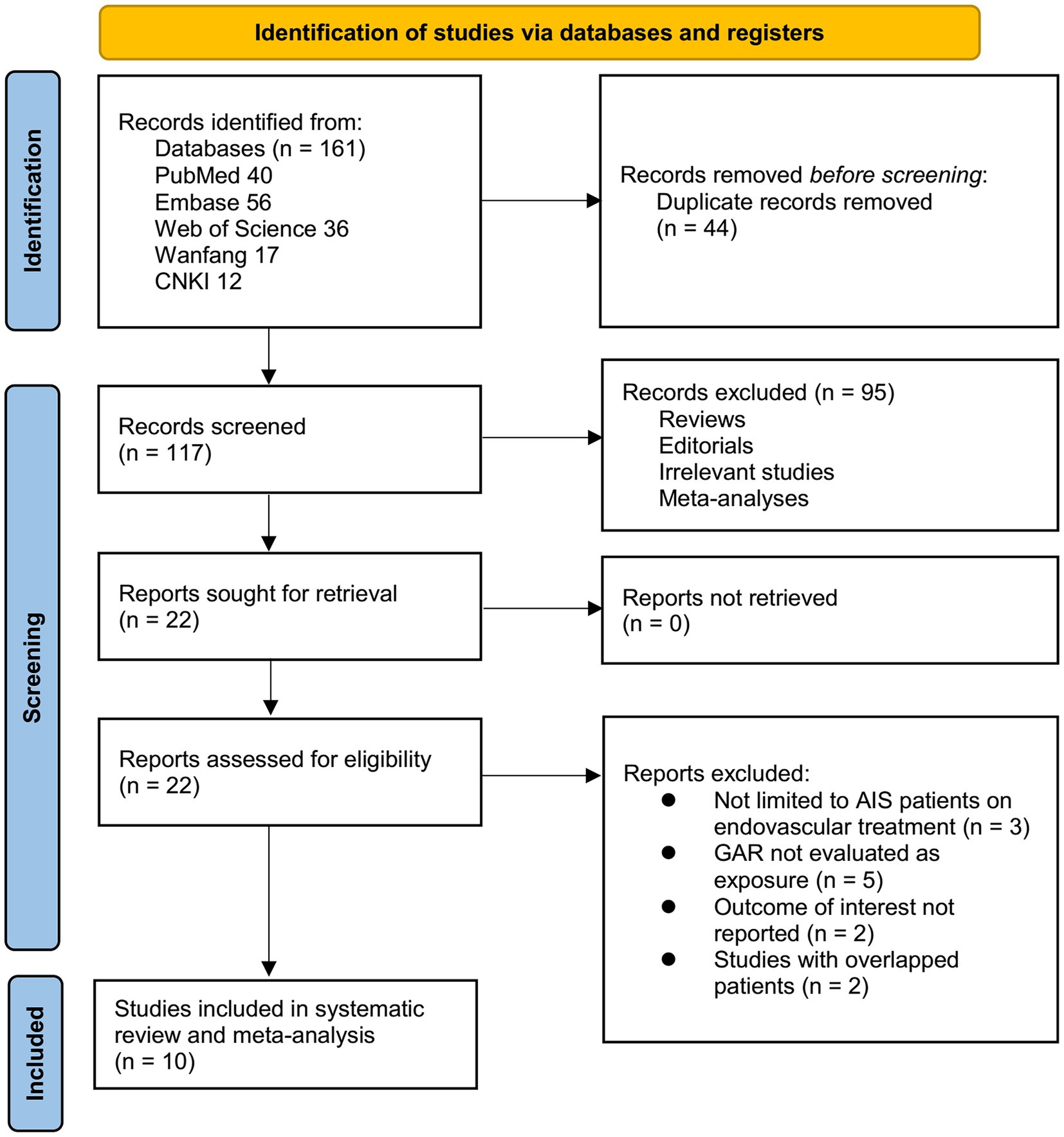 The study selection process is summarized in Figure 1. A total of 161 records were initially retrieved from five databases. After removing 44 duplicates, 117 articles underwent title and abstract screening, with 95 excluded for not meeting the inclusion criteria. The full texts of the remaining 22 articles were reviewed independently by two authors, and 12 were excluded for various reasons (Figure 1). Ultimately, 10 studies were included in the quantitative analysis (14–23).