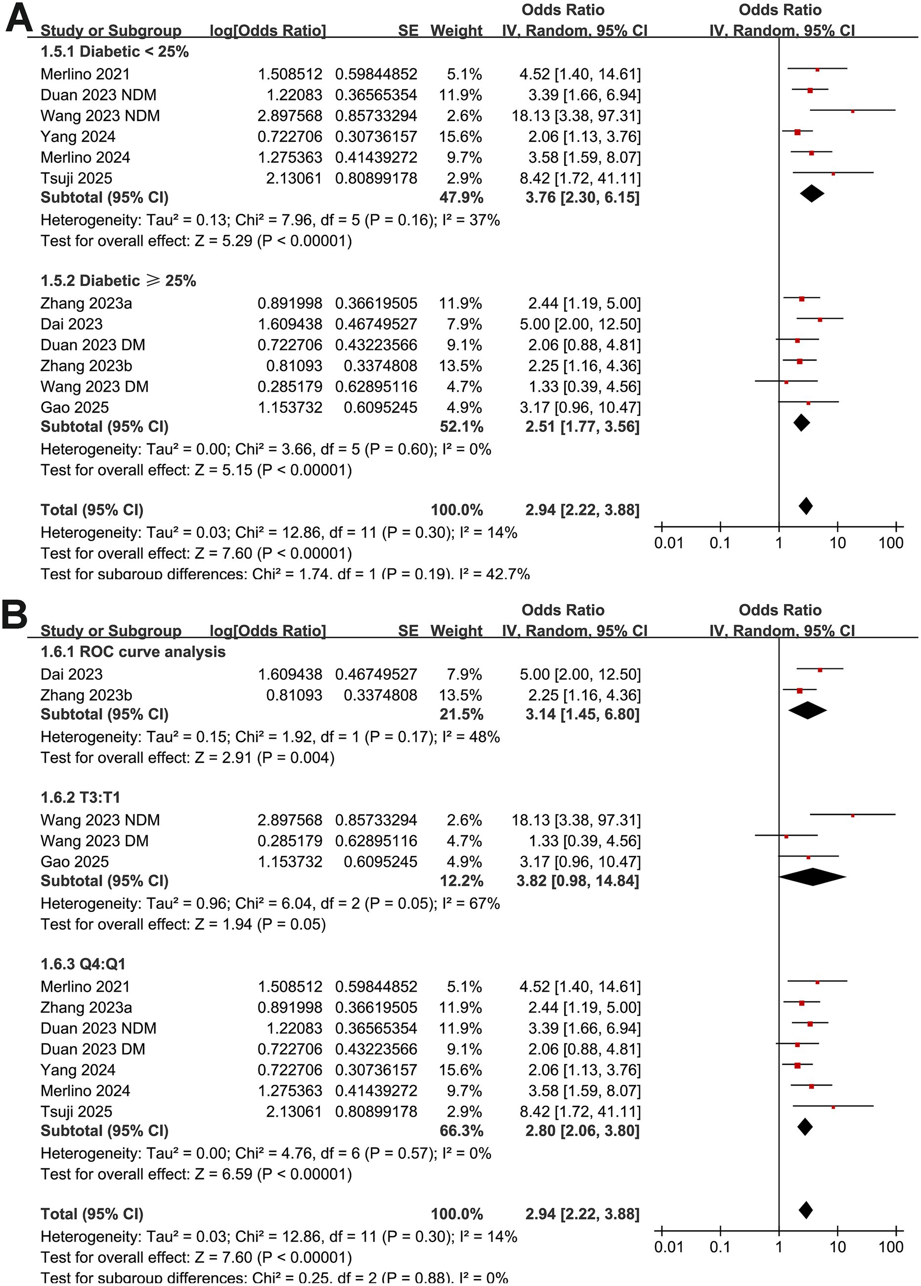 Figure 4. Forest plots for the subgroup analyses of the association between GAR and 90-day poor functional outcome in patients with IS after EVT. (A) Subgroup analysis according to the proportion of patients with diabetes; (B) subgroup analysis according to the methods for defining cutoffs of GAR.