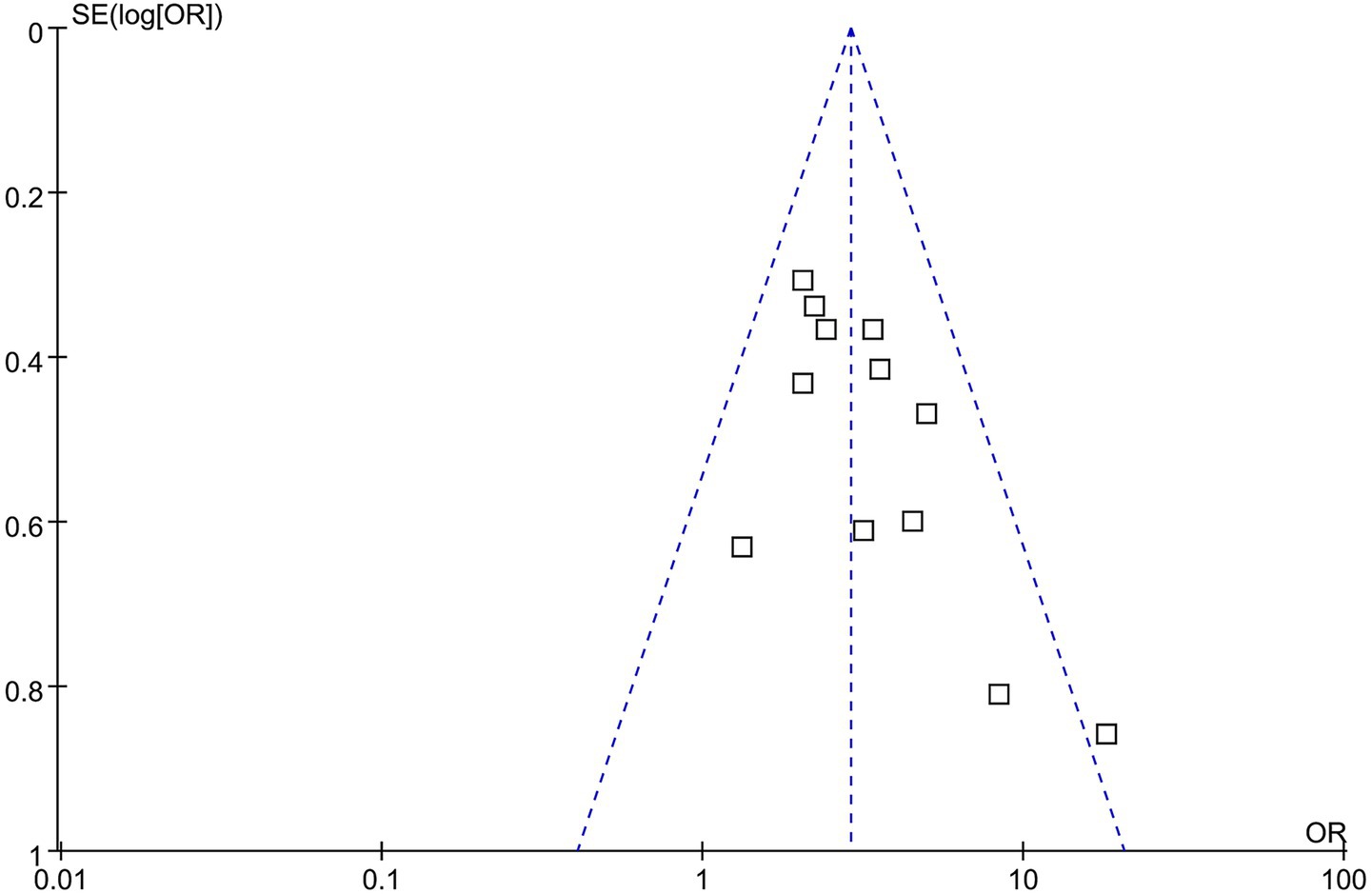 Figure 6. Funnel plots for estimating the potential publication bias underlying the meta-analysis of the association between GAR and 90-day poor functional outcome in patients with IS after EVT.