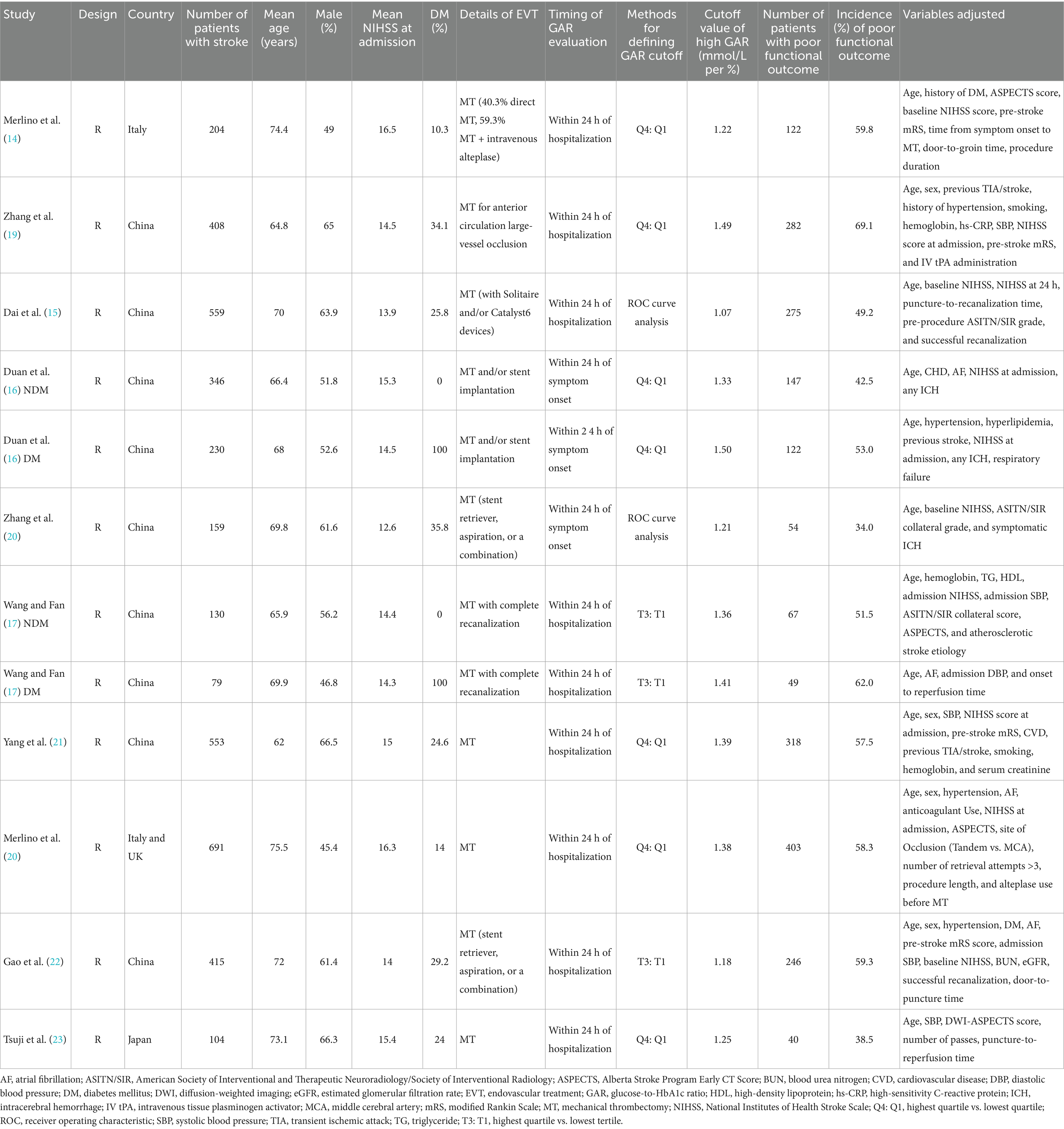 Table 1 summarizes the key characteristics of the 12 datasets derived from 10 studies included in this meta-analysis (14–23). Two studies (16, 17) reported outcomes separately for patients with and without diabetes, and these were analyzed as independent datasets, making 12 datasets available for the meta-analysis. The studies were published between 2021 and 2025 and conducted across Italy, the United Kingdom, Japan, and China. All were retrospective cohort studies and together included 3,878 patients with acute IS treated with EVT. Sample sizes ranged from 79 to 691 patients, with mean ages spanning 62.0 to 75.5 years, and the proportion of male patients ranging from 45.4 to 66.5%. Baseline stroke severity, measured by the NIHSS, varied between studies, with mean values from 12.6 to 16.5. GAR was consistently measured within 24 h of hospitalization or symptom onset, but detailed information on whether the glucose sample was strictly fasting, or on the exact timing relative to the EVT procedure, was generally not reported. The cutoff values for defining high vs. low GAR varied: most studies used the highest vs. lowest quartile (Q4: Q1) (14, 16, 18, 20, 21, 23), while others applied tertile-based cutoffs (T3: T1) (17, 22) or receiver operating characteristic (ROC) curve analysis (15, 19). The cutoff values for defining a high GAR varied from 1.07 to 1.50. Poor functional outcome was uniformly defined as an mRS score of 3–6 at 90 days, with incidence rates ranging from 34.0 to 69.1%. Overall, 2,125 (54.8%) patients had a poor functional outcome at 90 days. Multivariate analysis was performed in all studies. Covariate adjustment varied across studies, with most models including age, sex, baseline NIHSS, vascular risk factors (e.g., hypertension, diabetes, atrial fibrillation), pre-stroke mRS, imaging parameters (e.g., Alberta Stroke Program Early CT Score, collateral status), and procedural factors such as time to reperfusion.