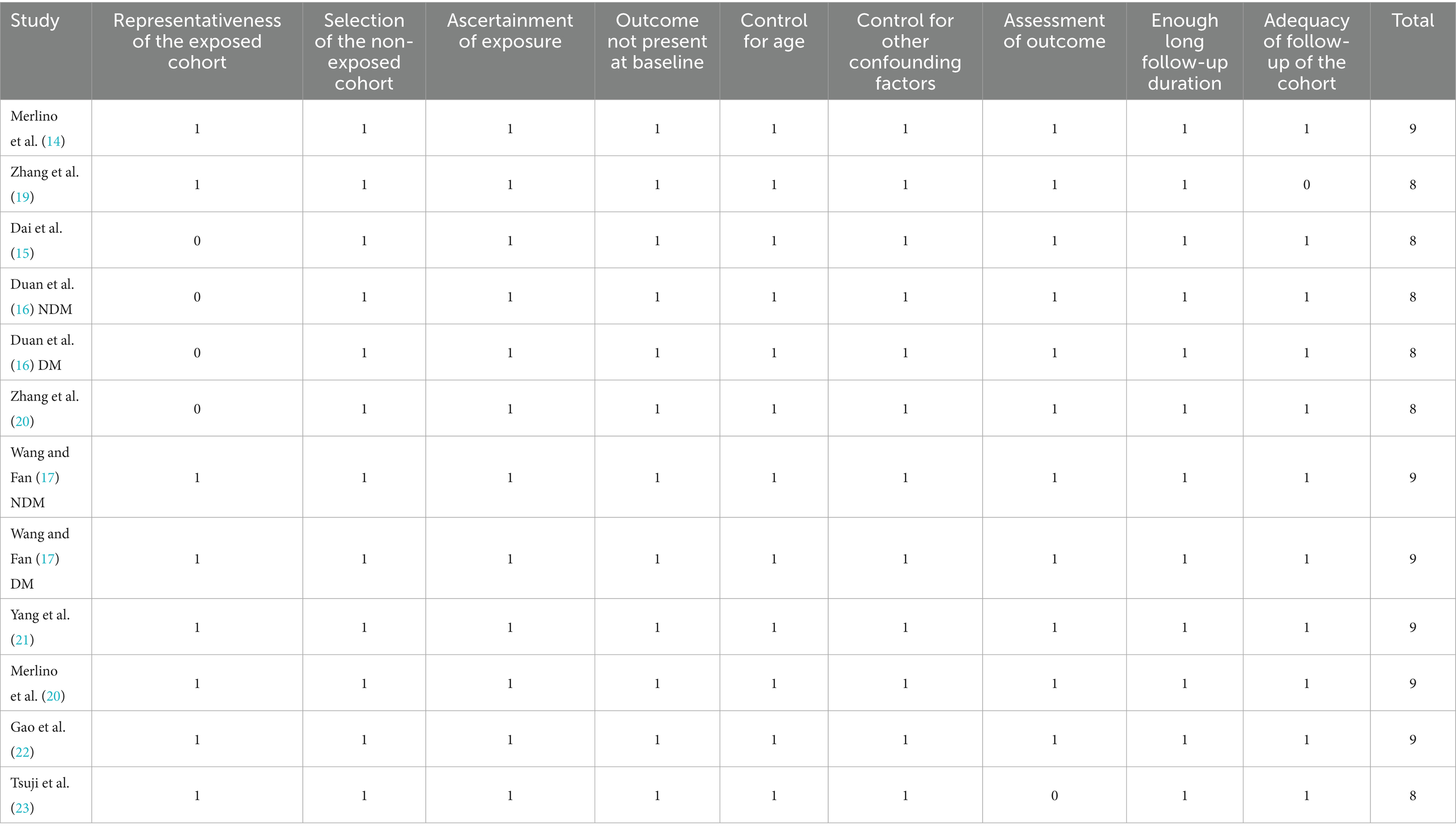 Table 2 presents the quality assessment of the included datasets using the NOS. Overall, methodological quality was moderate to high, with total scores ranging from 8 to 9 out of a maximum of 9. Six datasets achieved the maximum score of 9 (14, 17, 20–22), while the remaining six scored 8 points (15, 16, 18, 19, 23). Lower scores were mainly attributed to the limited representativeness of the exposed cohort or slightly incomplete follow-up. All datasets demonstrated robust ascertainment of exposure, appropriate selection of non-exposed cohorts, and reliable outcome assessment, supporting the validity of the data synthesized in this meta-analysis.