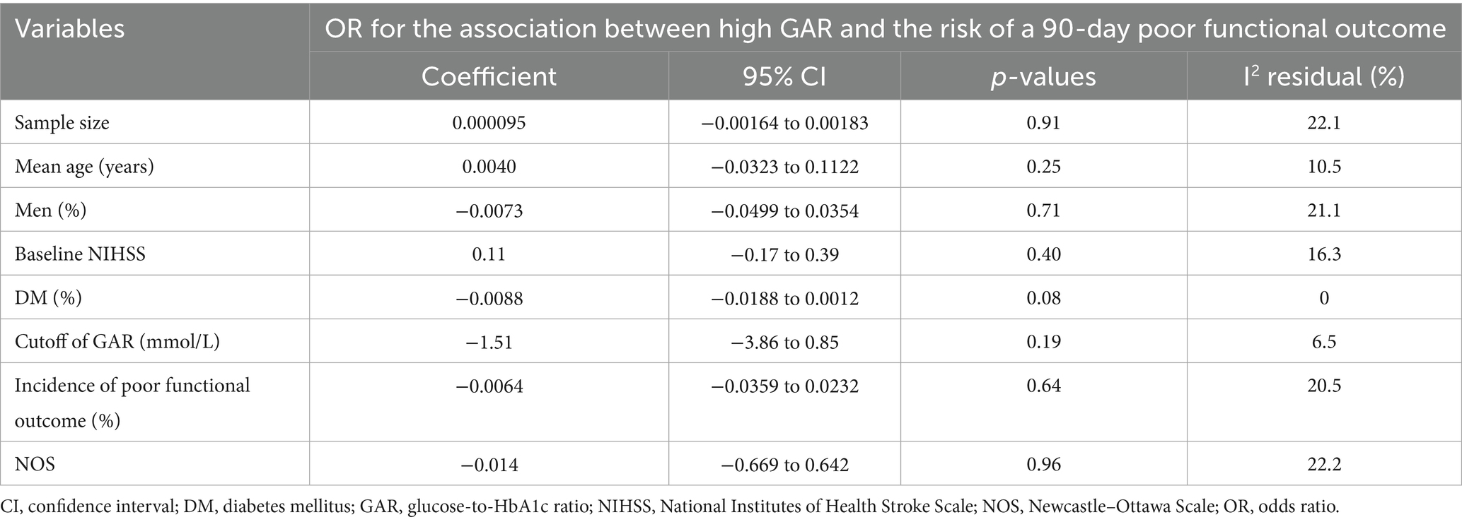 Results of the univariate meta-regression analysis are presented in Table 3. The proportion of patients with diabetes in each study showed a negative, though not statistically significant, correlation with the pooled OR for the association between GAR and poor functional outcome (coefficient = −0.0088, p = 0.08; Table 3 and Figure 2B). Notably, variation in diabetic status across datasets appeared to fully account for the observed heterogeneity (I2 residual = 0%). In contrast, other study-level factors, including sample size, mean age, proportion of men, baseline NIHSS, GAR cutoff values, incidence of poor functional outcome, and study quality scores, did not demonstrate any meaningful association with the pooled results.