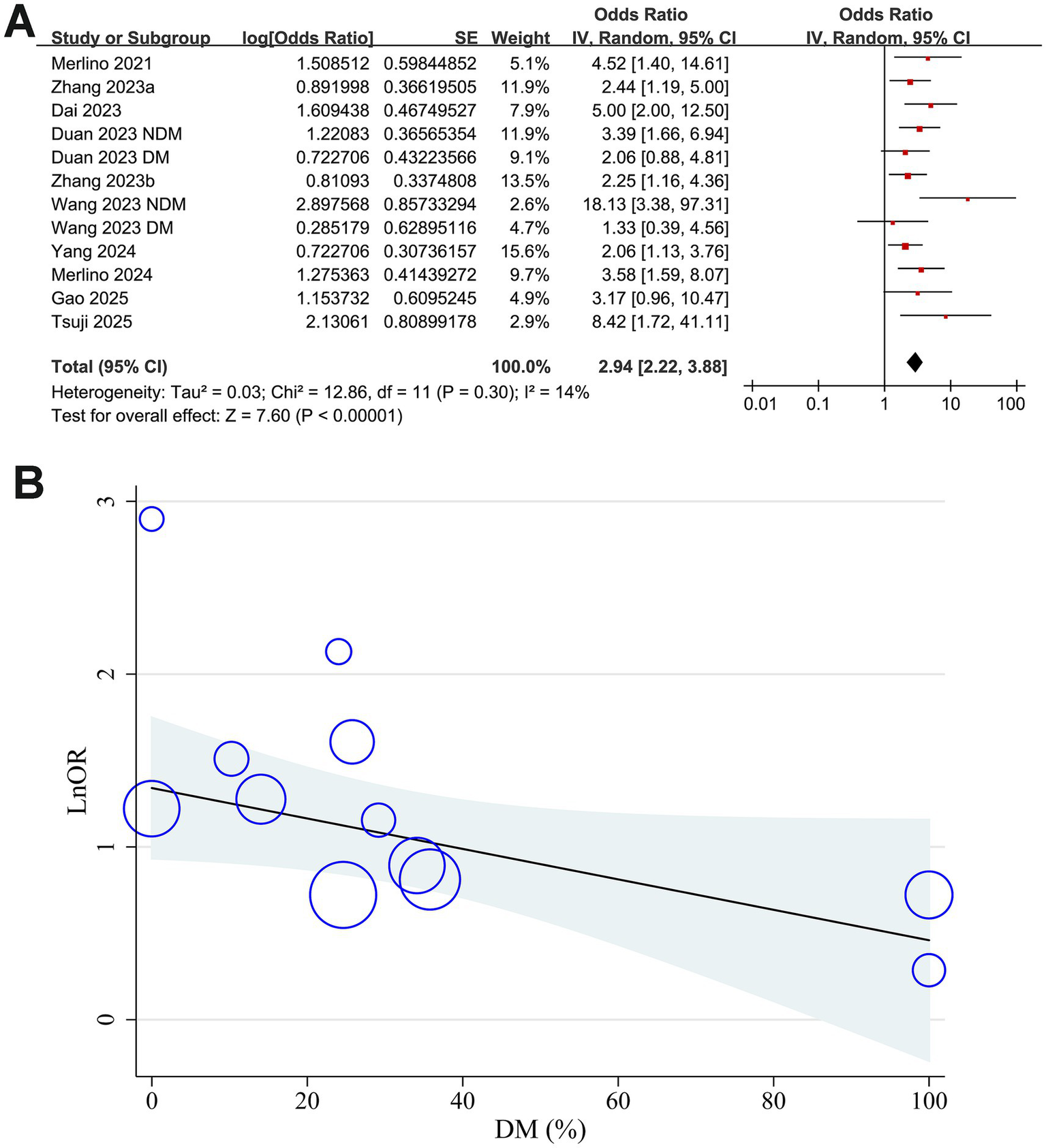 Forest plots and meta-regression analysis examining the impact of diabetes on the association between GAR and 90-day poor functional outcome in patients with IS after EVT. (A) Overall meta-analysis; (B) correlation between the proportion of patients with diabetes and the pooled OR.