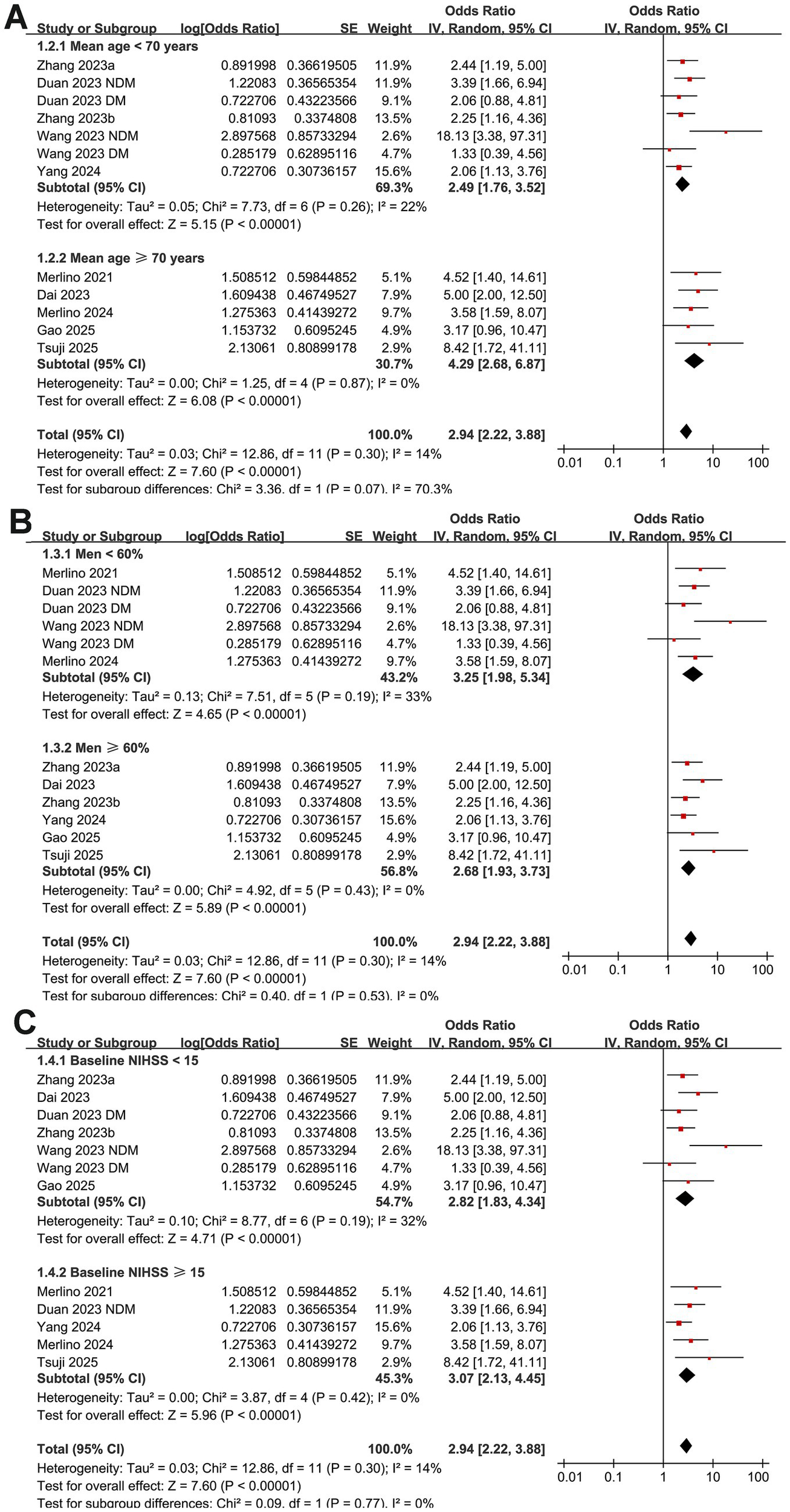 Forest plots for the subgroup analyses of the association between GAR and 90-day poor functional outcome in patients with IS after EVT. (A) Subgroup analysis according to mean ages of the patients; (B) subgroup analysis according to the proportion of men; (C) subgroup analysis according to the mean NIHSS at admission.